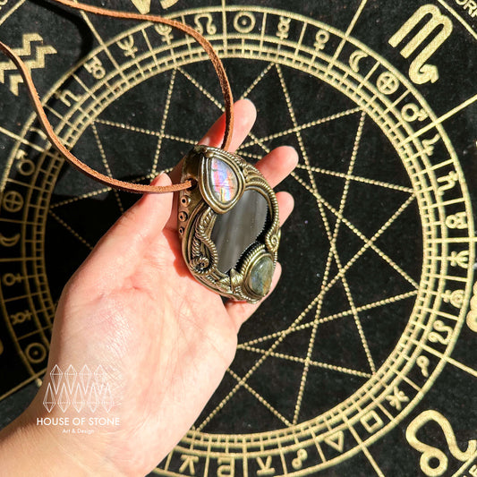 Natural Handmade Black Obsidian Pendant Necklace/Magic Obsidian Mirror Crystal Pendant/Scrying Mirror Labradorite Jewelry/Altar Tool