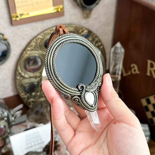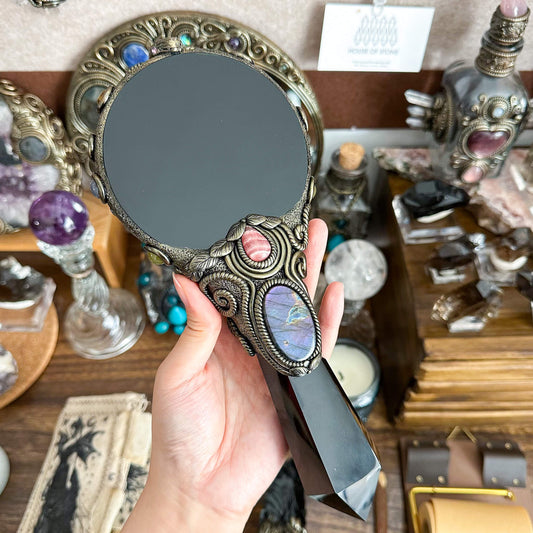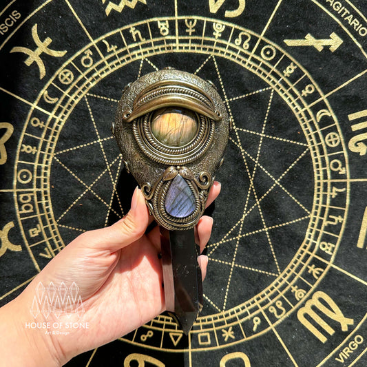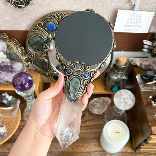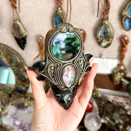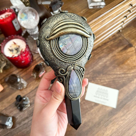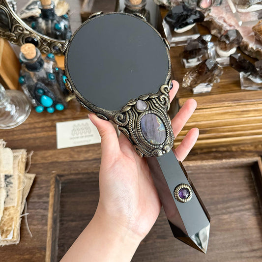 Handmade Natural Black Obsidian Mirror/Magic Obsidian Witch Wand/Crystal Quartz Wand/Scrying Mirror Wand/Root Chakra/Manifest Altar Tool