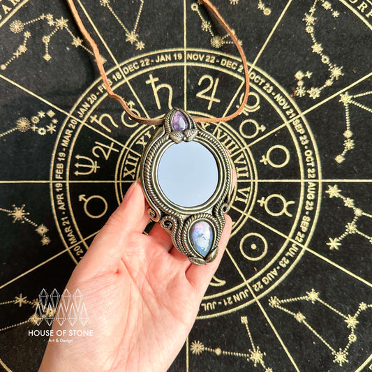 Handmade Natural Black Obsidian Pendant Necklace/Magic Obsidian Mirror Crystal Pendant/Scrying Mirror Labradorite Protection Jewelry/Altar Tool