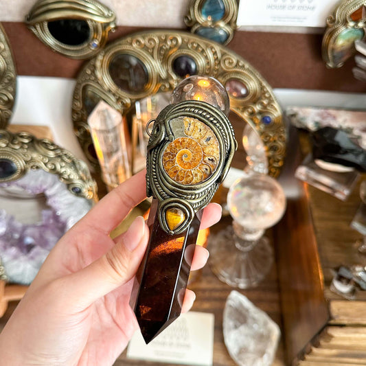 Handmade Natural Crystal Amethyst Antler Wand/Magic Smoky Quartz Witch Wand/Labradorite Amethyst Ammonite Antler Stem/Chakra/Altar Tool