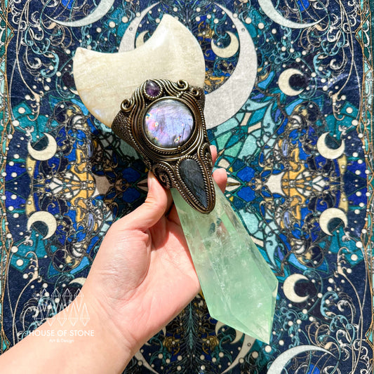 Handmade Natural Fluorite Crystal Wand/XLarge Magic Witch Crystal Wand/Moonstone Green Fluorite Labradorite Handle/Chakra/Manifest Altar Tool