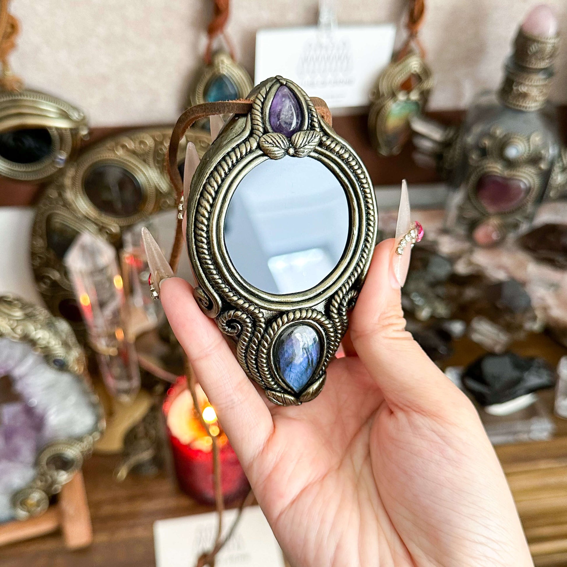 Black obsidian mirror, Amethyst, Labradorite, Clay
