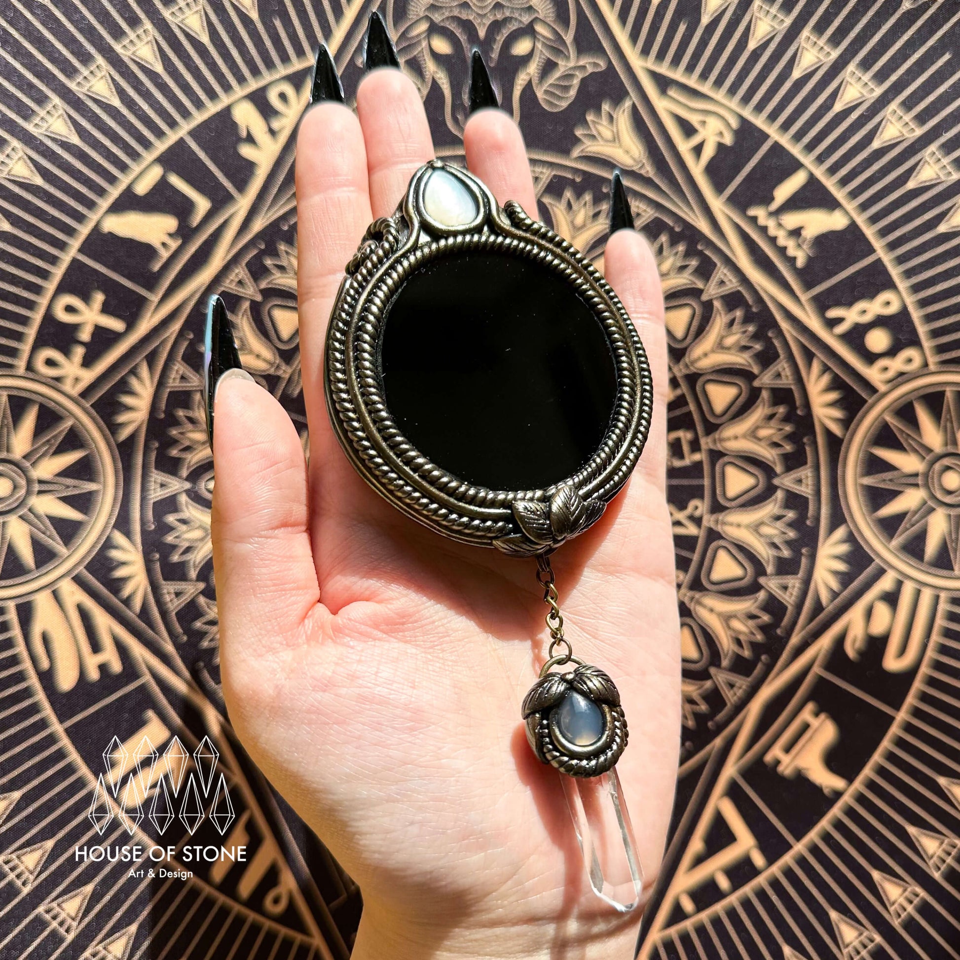 Black obsidian mirror, White Mother of Pearl, Agate, Clear quartz, Clay