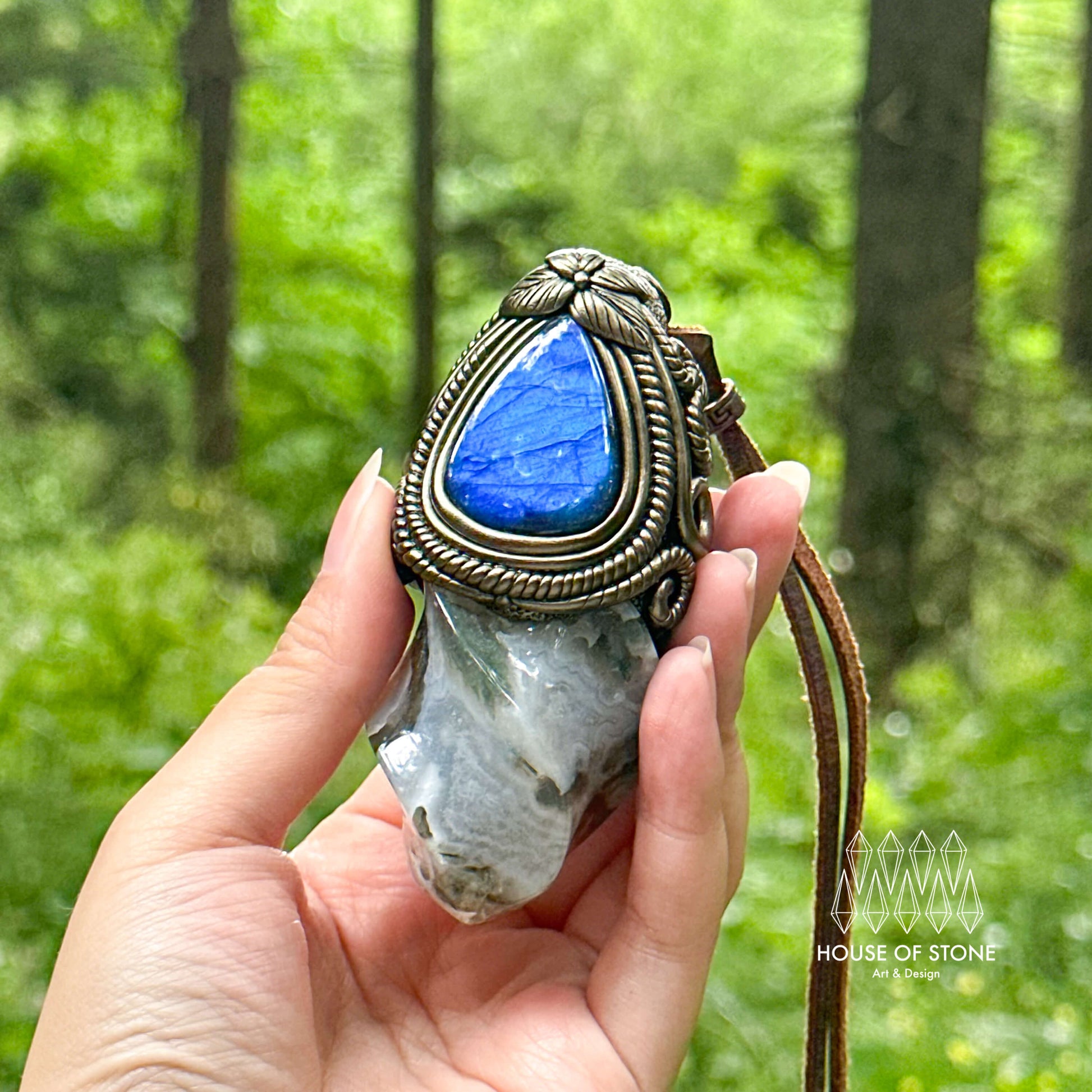 Natural Handmade Moss Agate Pendant Necklace/Magic Quartz Crystal Double-sided Pendant/Labradorite Jewelry/Chakra/Altar Tool