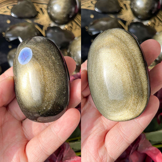 Natural Rare Gold Sheen Obsidian Palm Stone/Gold Obsidian Heart Carvings/Hand carved Obsidian Chakra Healing Stone