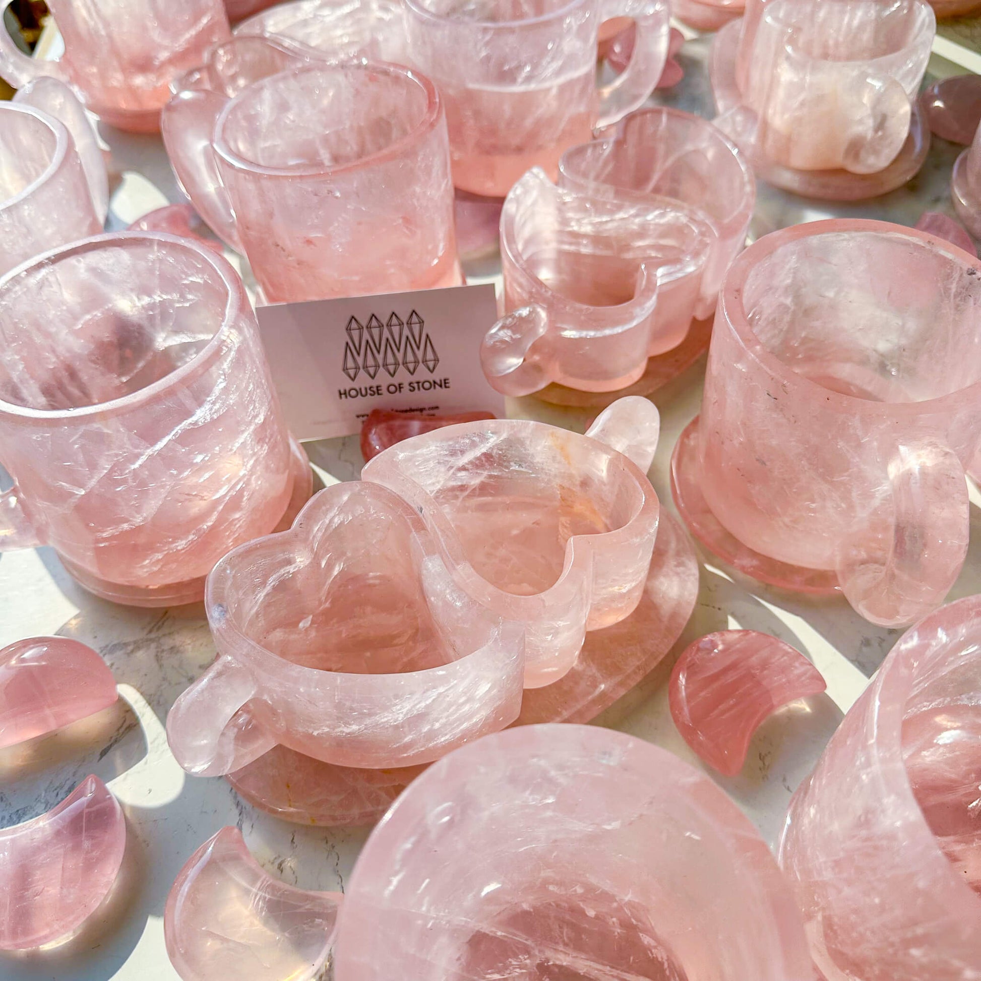 natural hand carved rose quartz cup mug with coaster heart chakra gift
