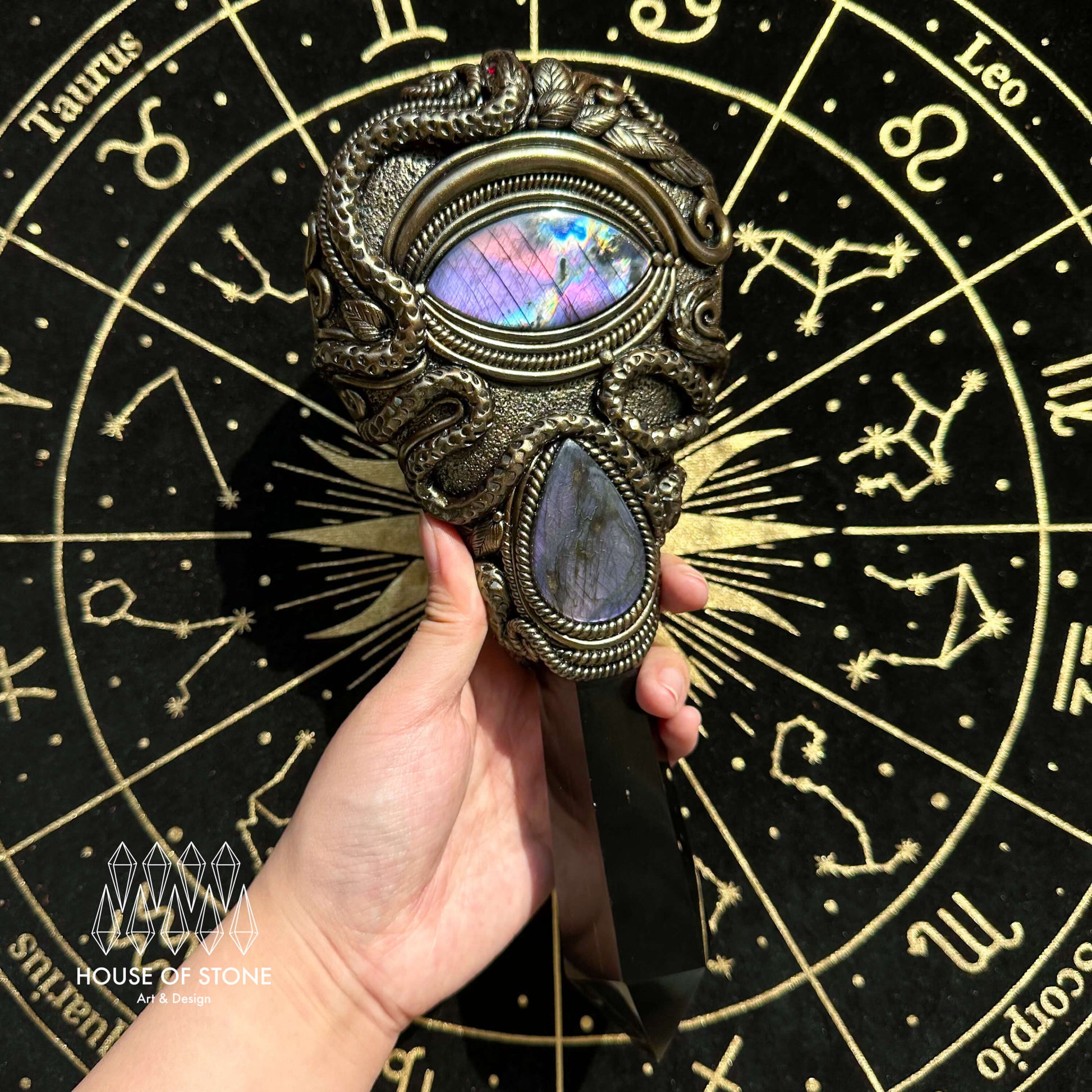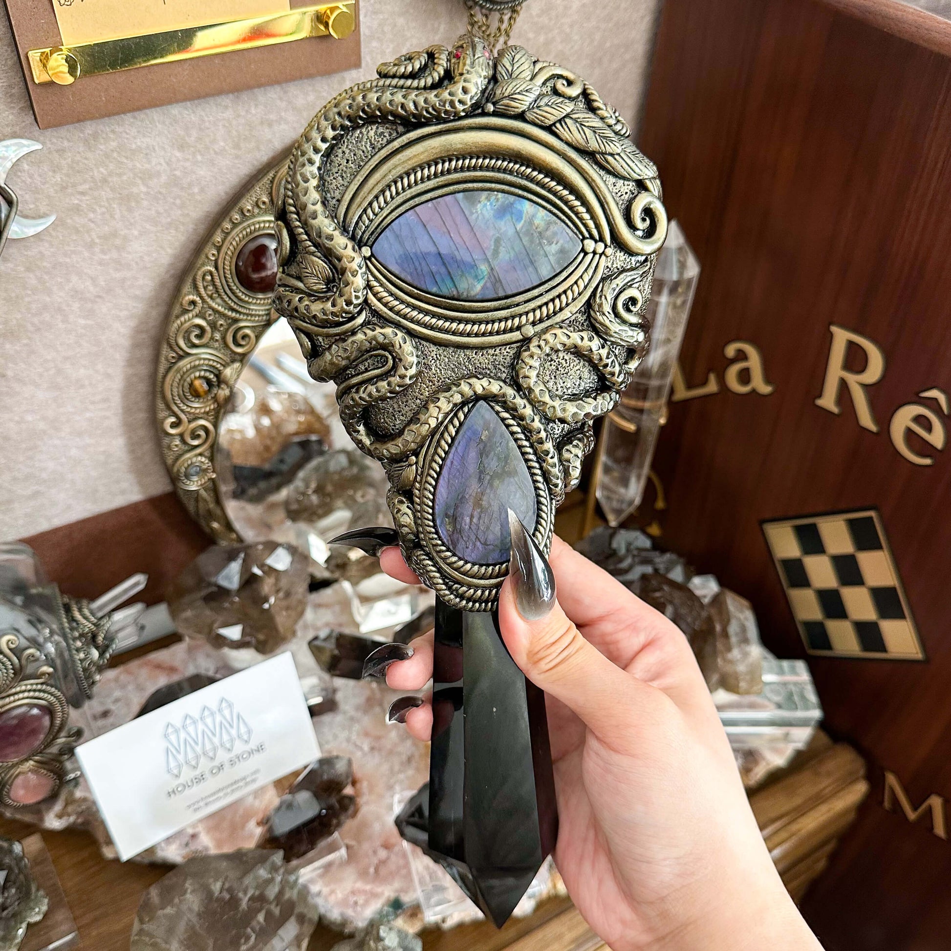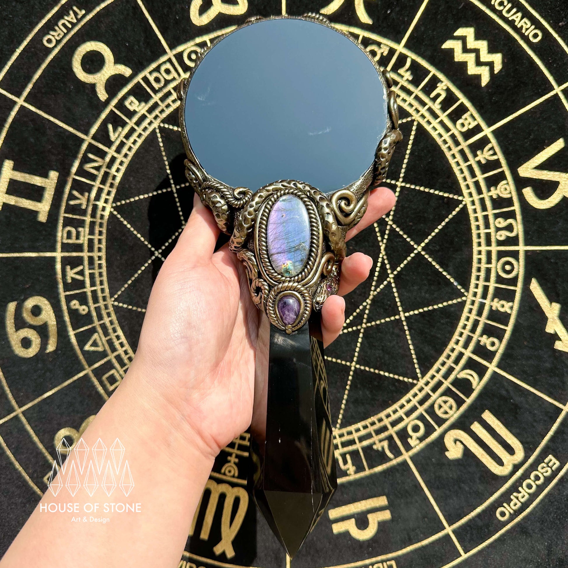 Black obsidian mirror, Amethyst, Labradorite, Clay