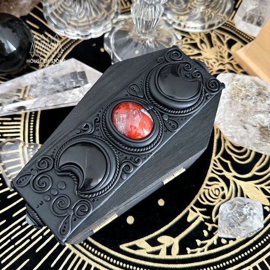 Natural Crystal Coffin Jewelry Box/Handmade Crystal Clay Coffin Stash Gift Box/Witchy Magic Gothic Crystal Rainbow Obsidian Box/Altar Tools