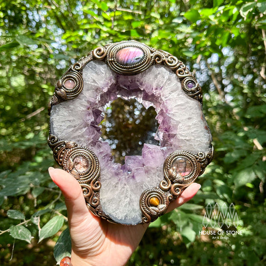 Natural Amethyst Portal Slice Geode Mirror/Brazil Amethyst Geode Druzy Portal Mirror/Handmade Crystal Portal Slice Mirror/Altar Tools