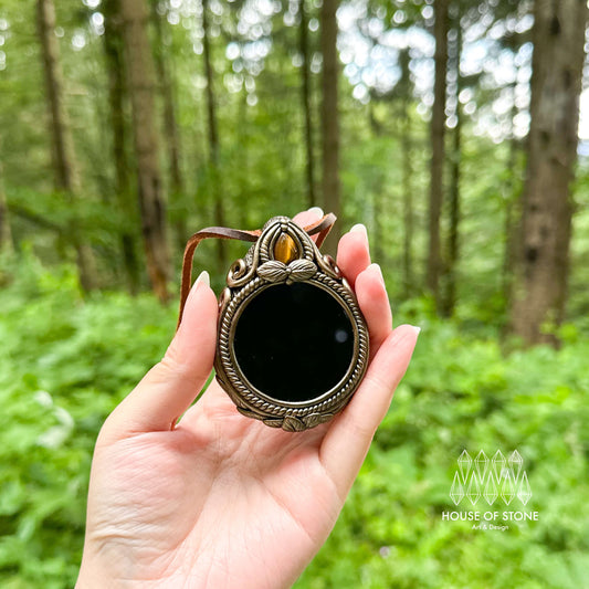 Natural Handmade Black Obsidian Pendant Necklace/Magic Obsidian Mirror Crystal Pendant/Scrying Mirror Tigers Eye Jasper Jewelry/Altar Tool