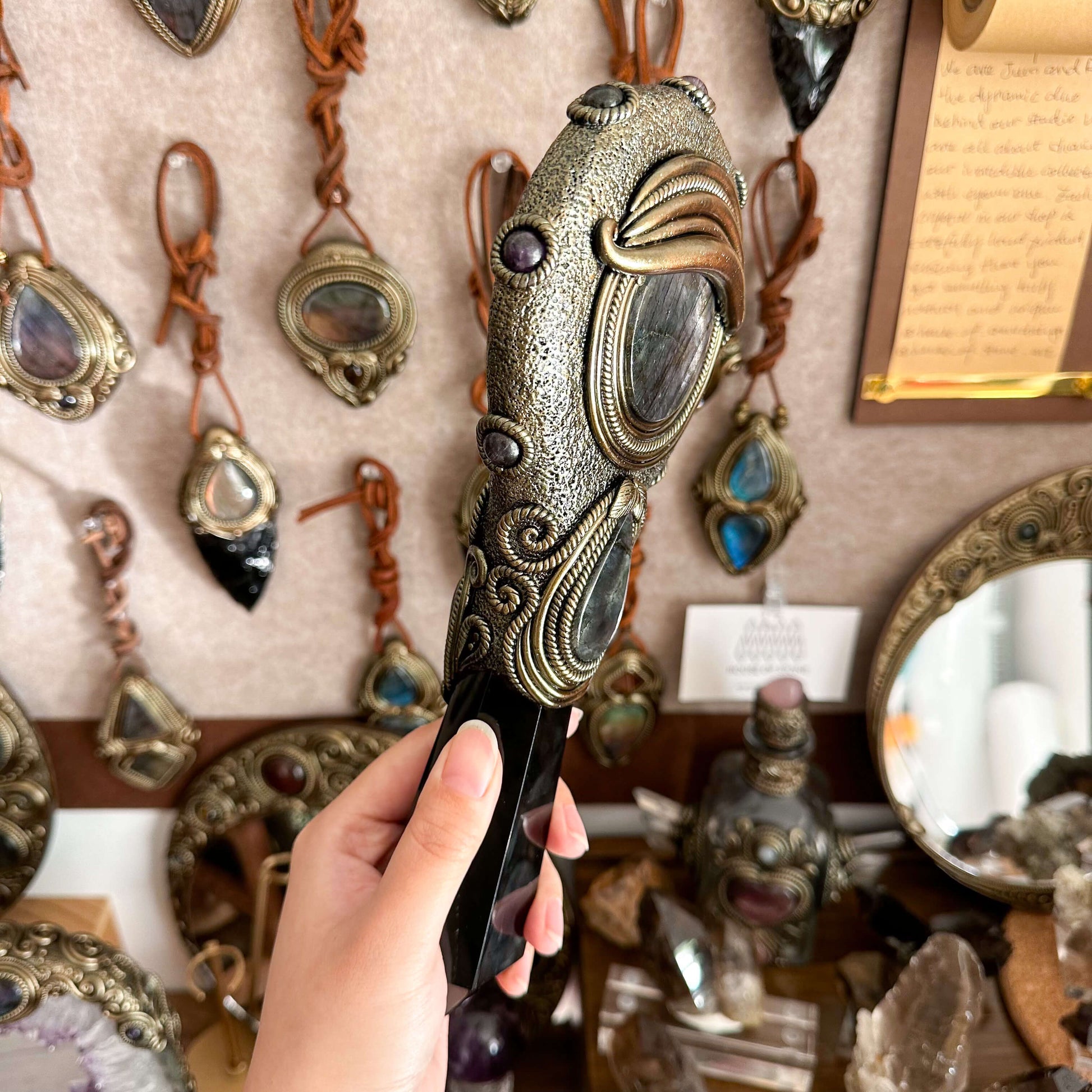Handmade Natural Black Obsidian Mirror/Magic Obsidian Witch Wand/Crystal Quartz Wand/Scrying Mirror Wand/Root Chakra/Manifest Altar Tool