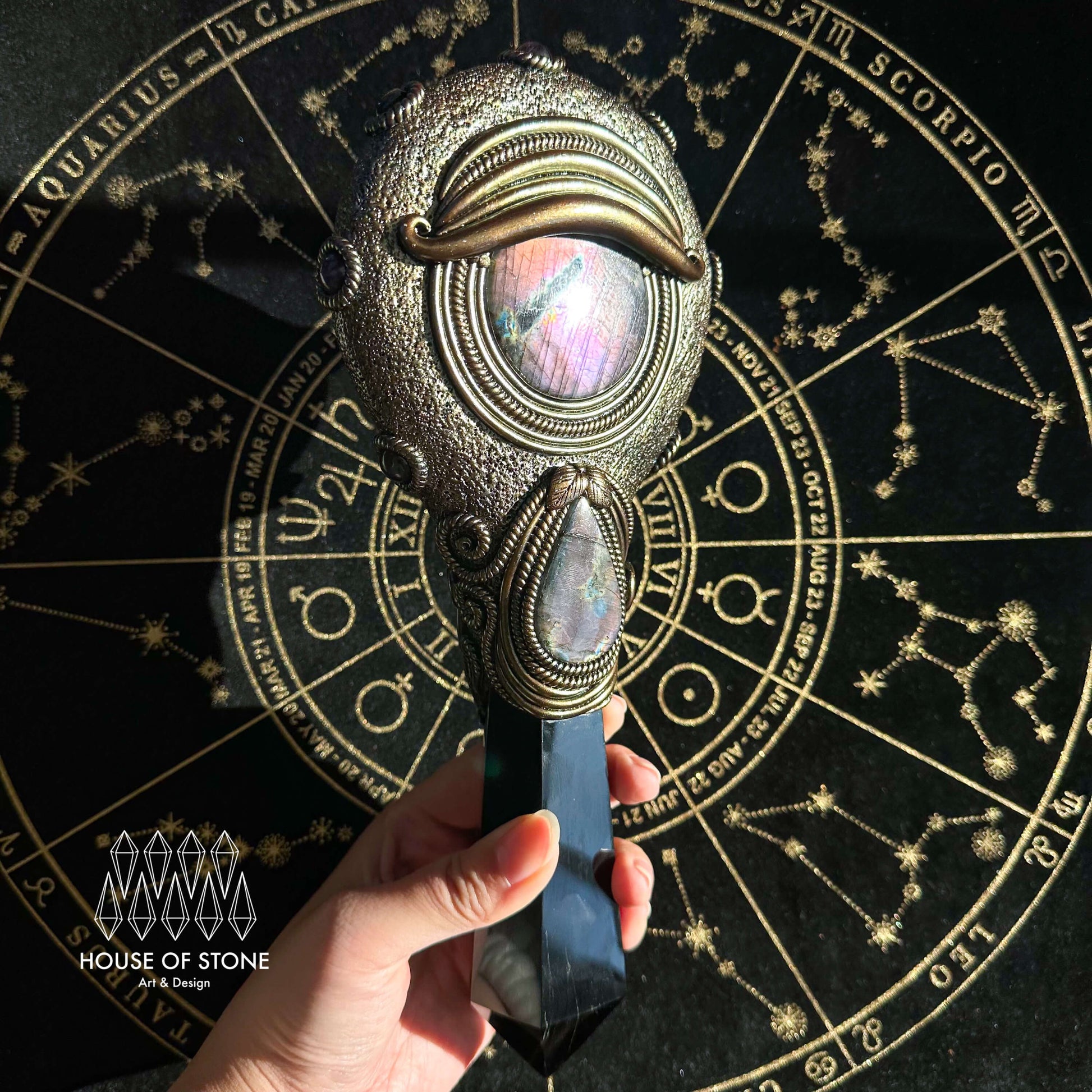 Black obsidian mirror, Amethyst, Labradorite, Clay