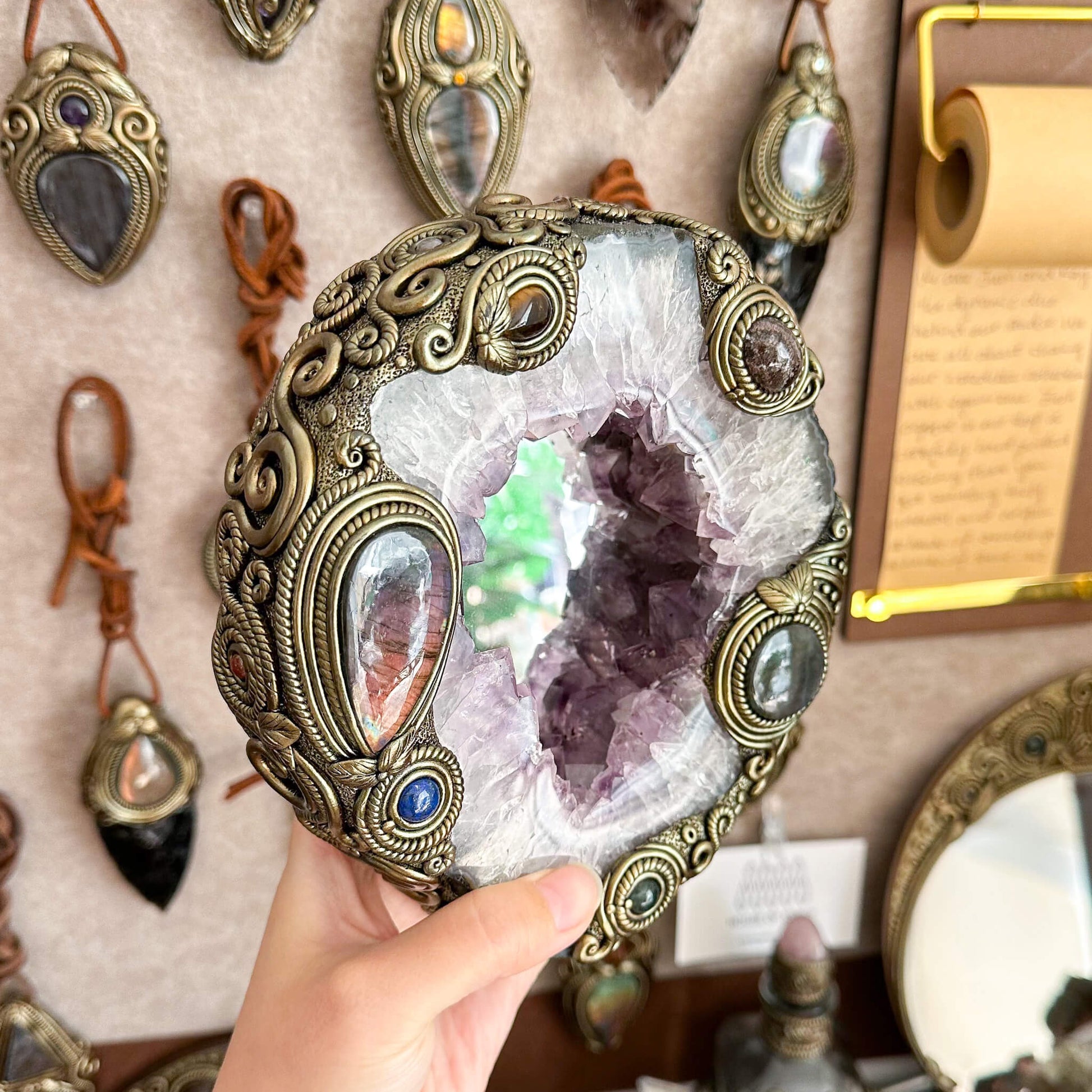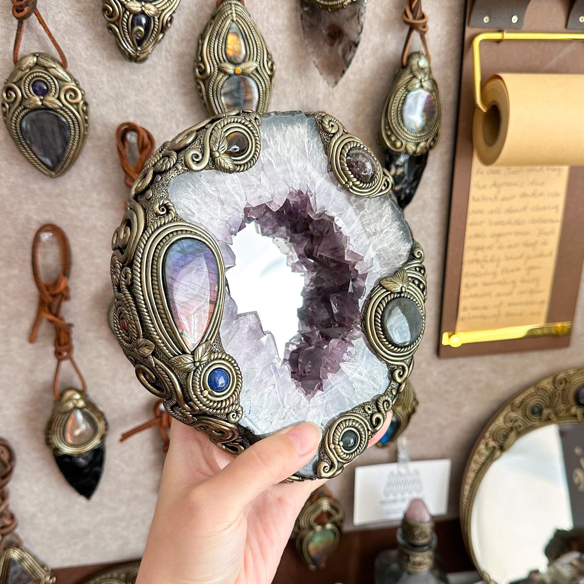 Natural Amethyst Portal Slice Geode Mirror/Brazil Amethyst Geode Druzy Portal Mirror/Handmade Crystal Portal Slice Mirror/Altar Tools