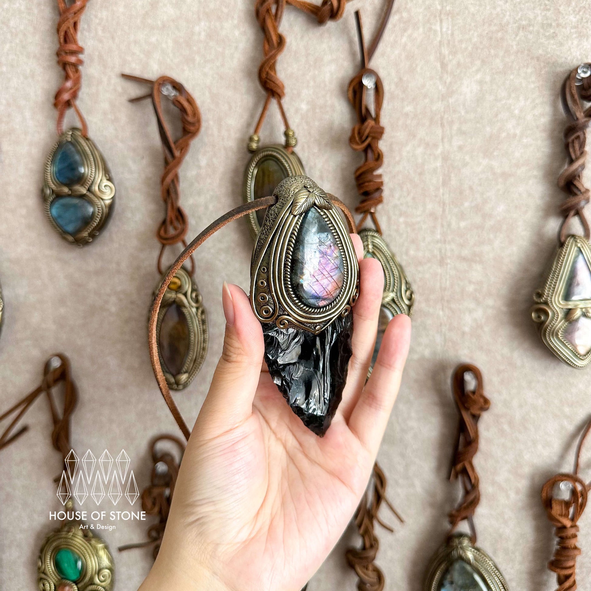 Natural Handmade Black Obsidian Arrowhead Pendant Necklace/Magic Crystal Double-sided Pendant/Labradorite Amethyst Jewelry/Chakra/Altar Tool