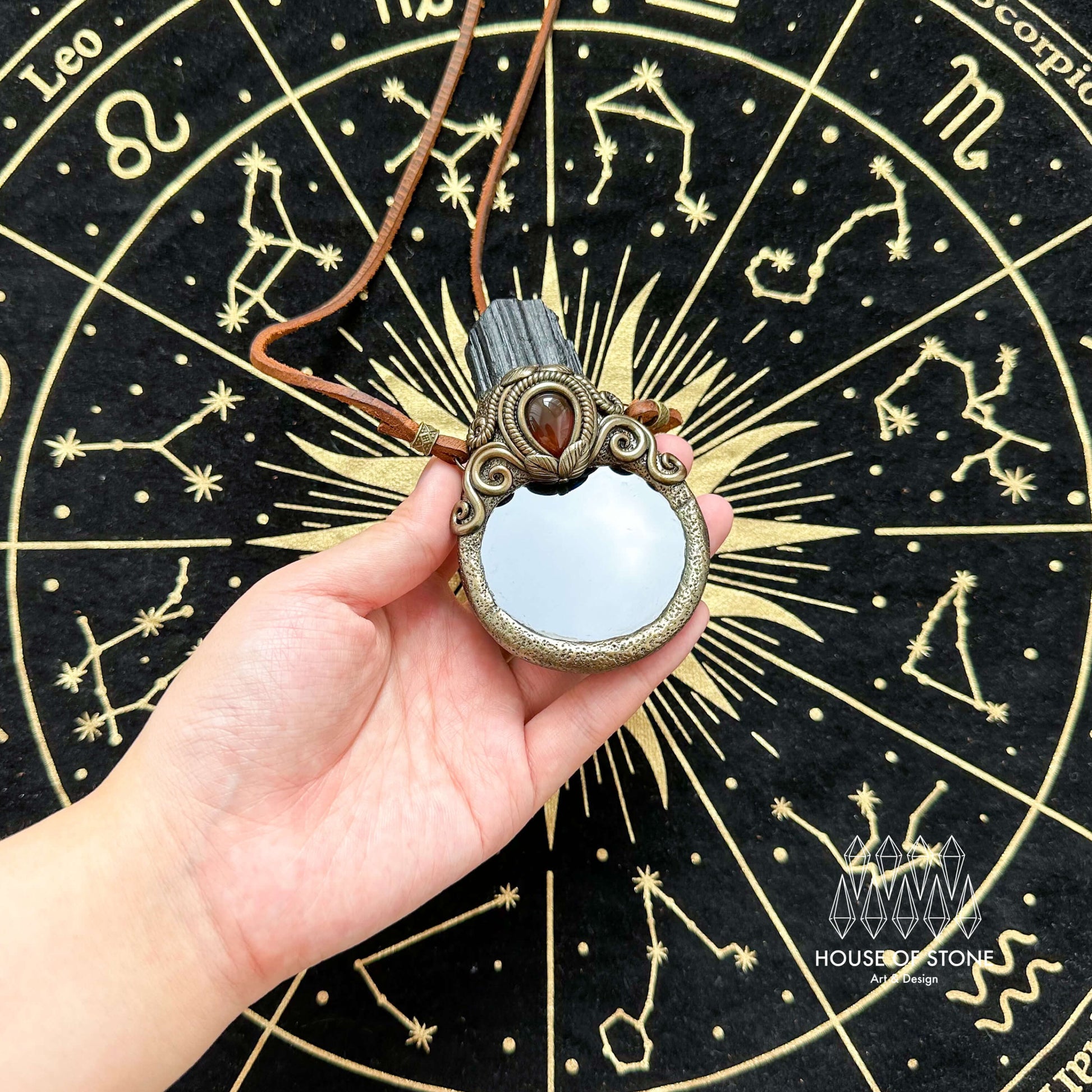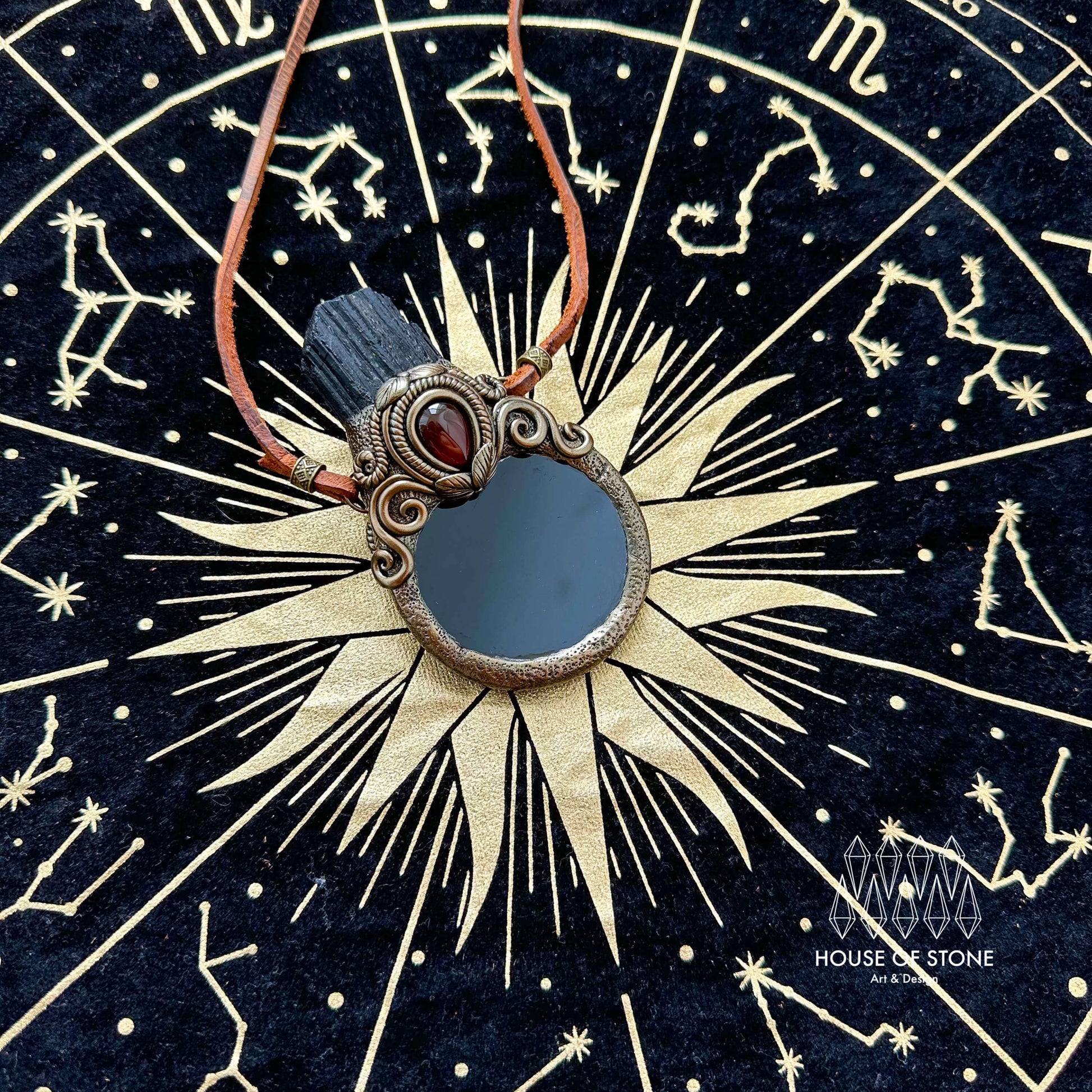 Natural Handmade Black Obsidian Pendant Necklace/Magic Black Tourmaline Mirror Crystal Pendant/Scrying Mirror Amethyst Jewelry/Chakra/Altar Tool