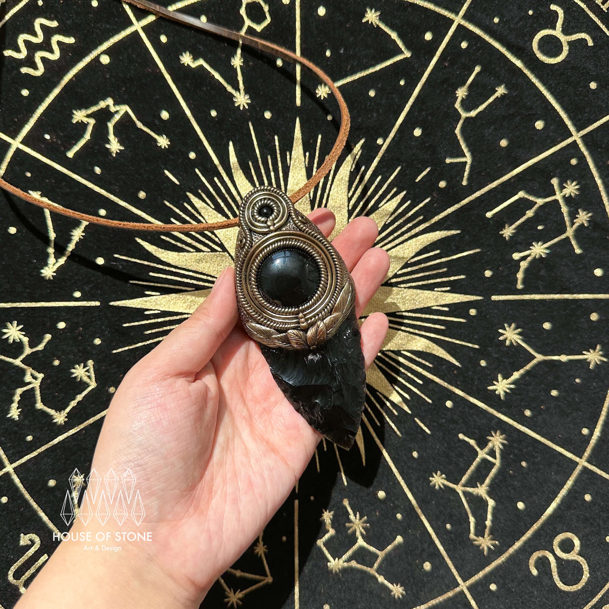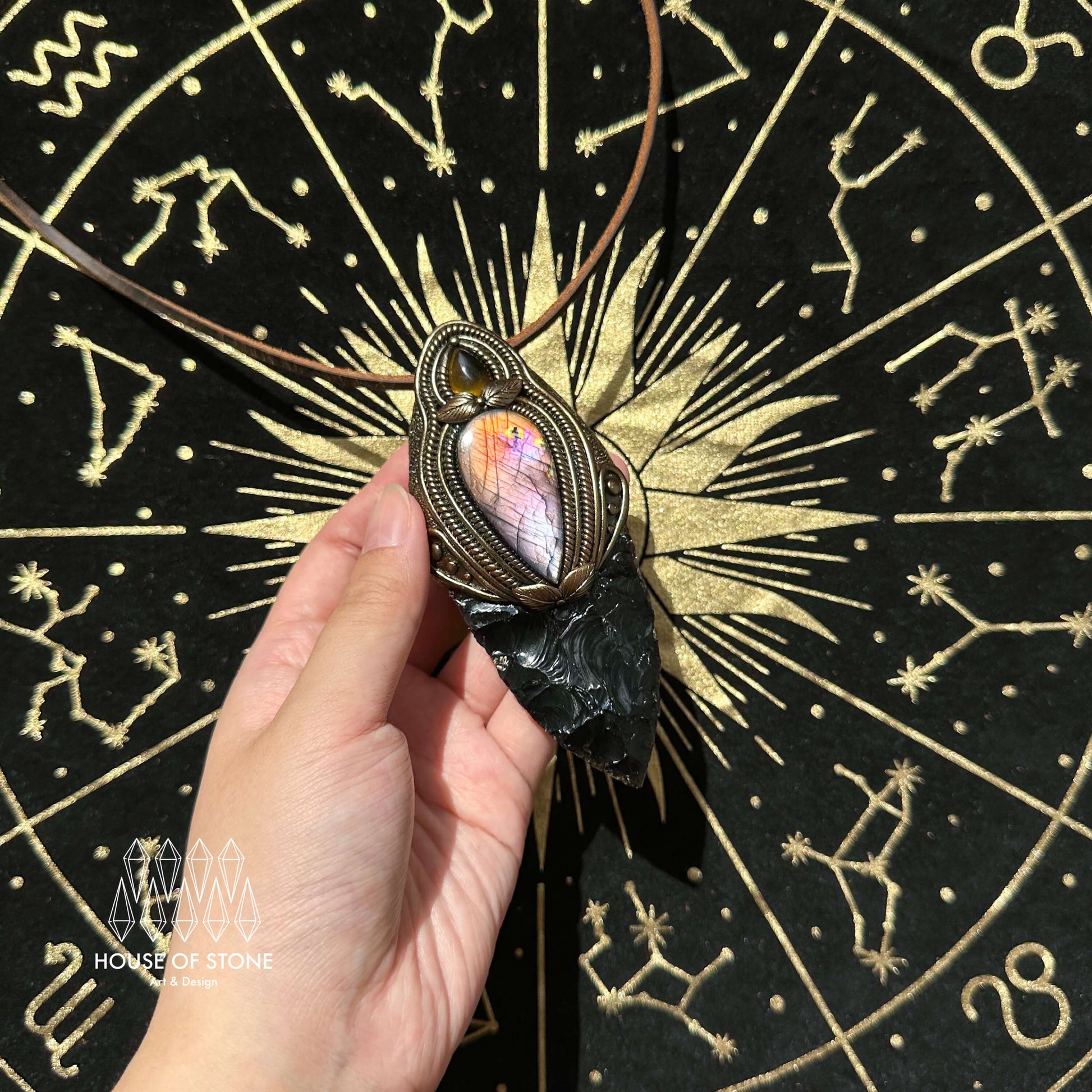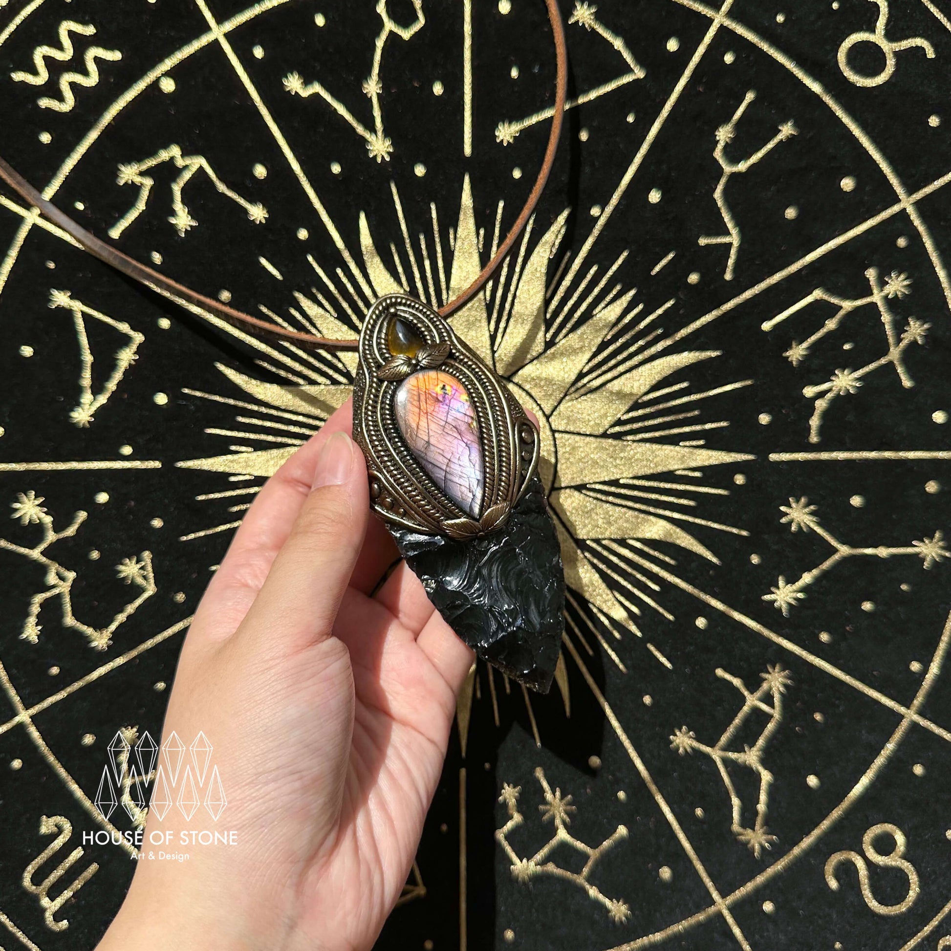 Natural Handmade Black Obsidian Pendant Necklace/Magic Crystal Double-sided Pendant/Labradorite Tigers Eye Jasper Jewelry/Chakra/Altar Tool