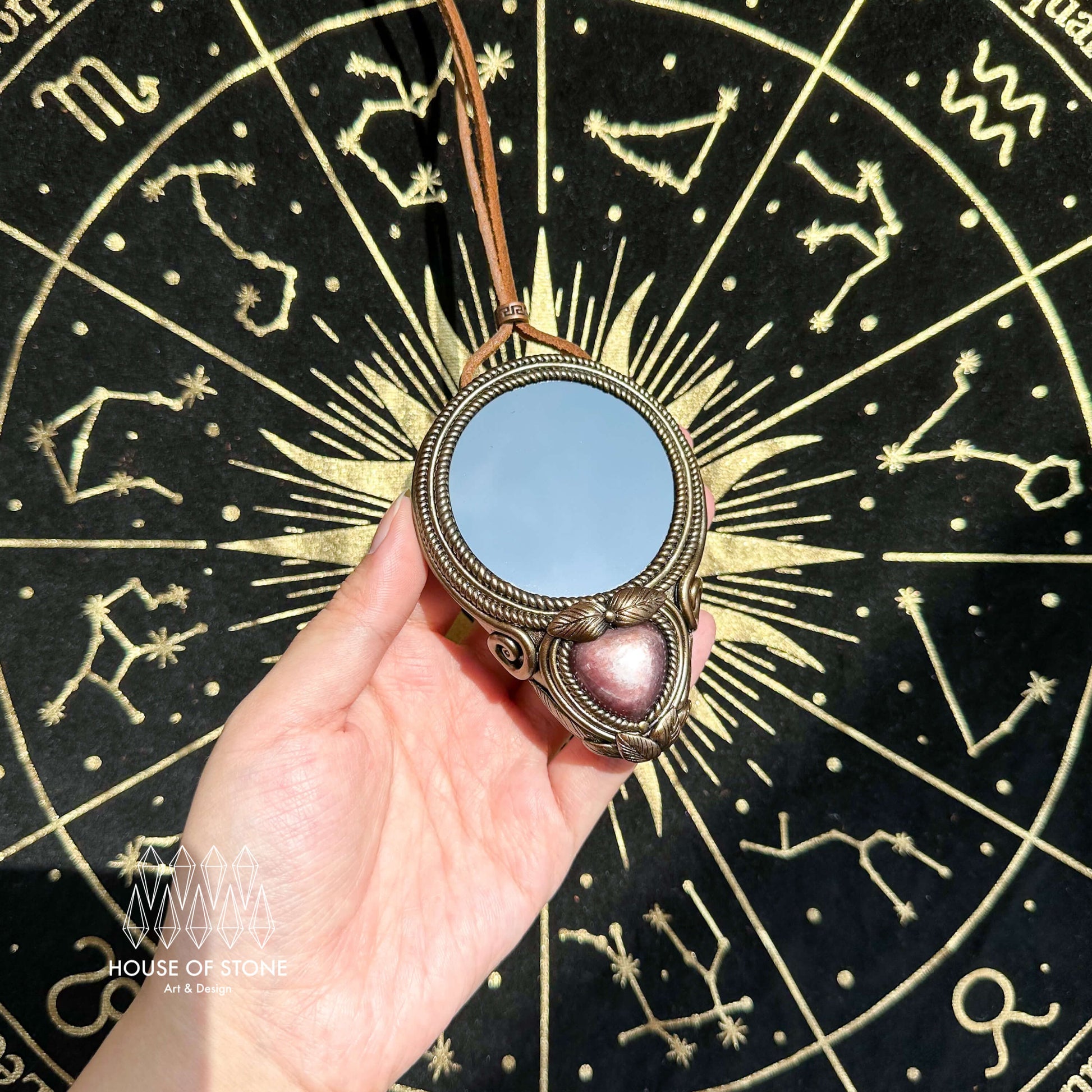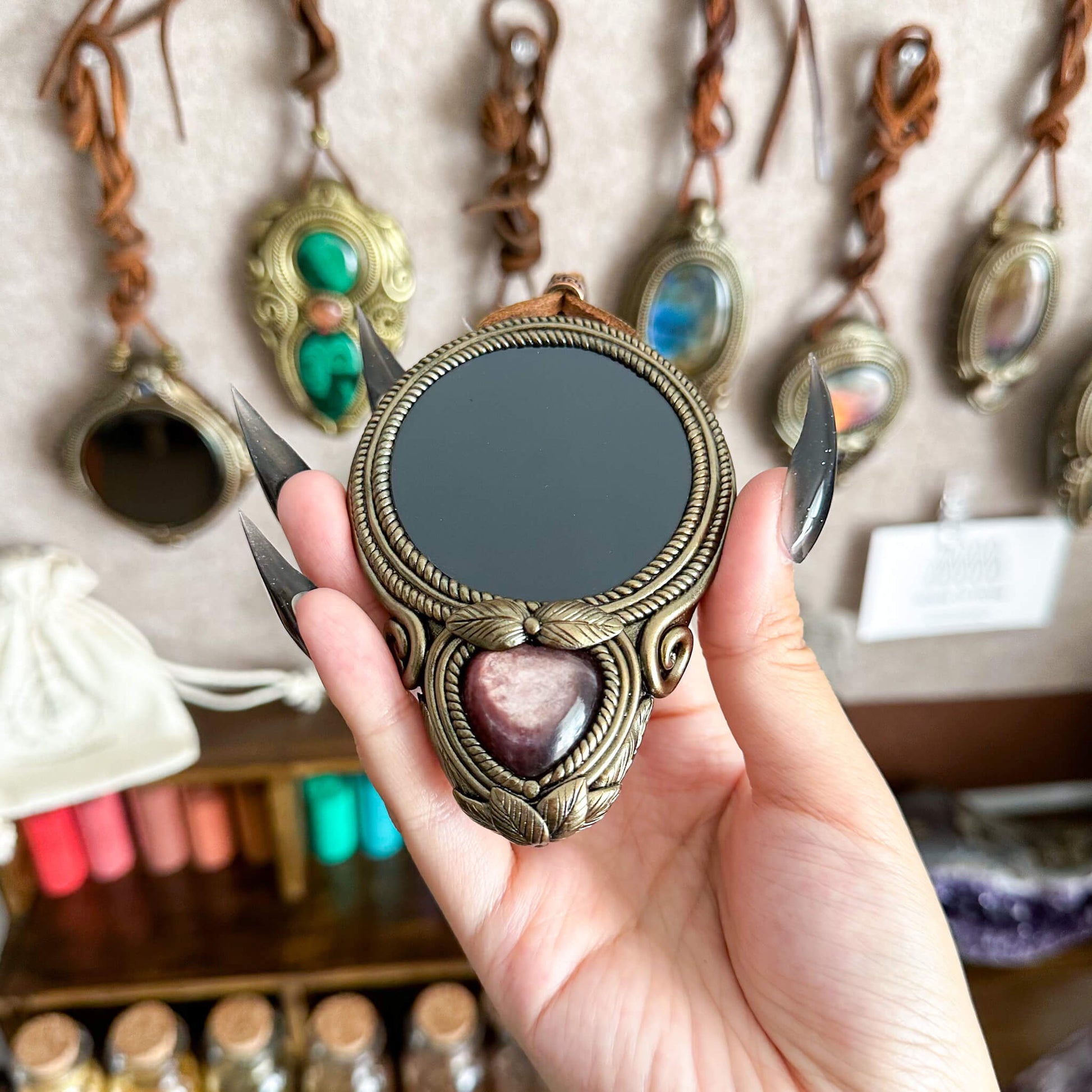 Natural Handmade Black Obsidian Pendant Necklace/Magic Obsidian Mirror Crystal Pendant/Scrying Mirror Purple Lepidolite Jewelry/Altar Tool