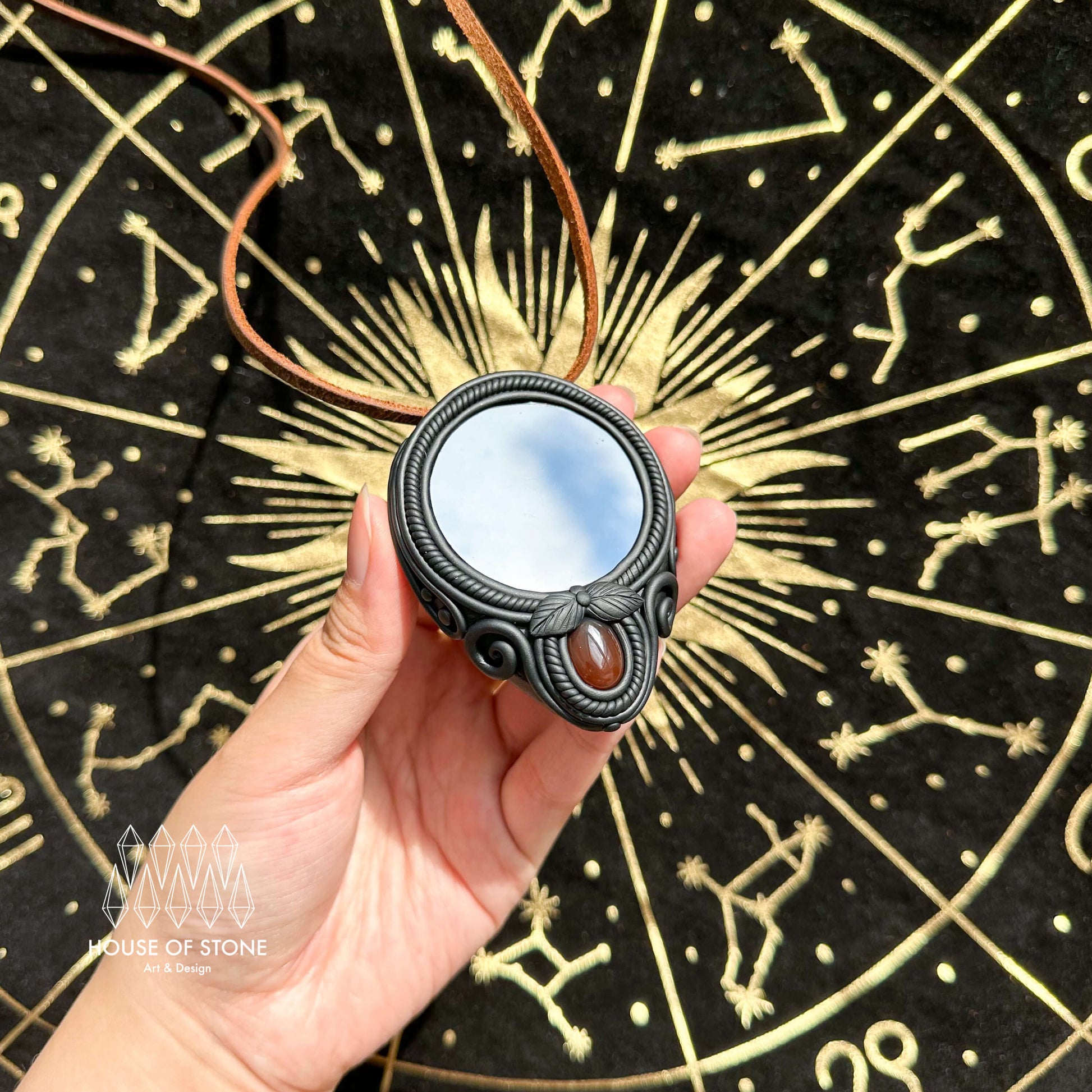 Natural Handmade Black Obsidian Pendant Necklace/Magic Obsidian Mirror Crystal Pendant/Scrying Mirror Red Agate Jewelry/Altar Tool