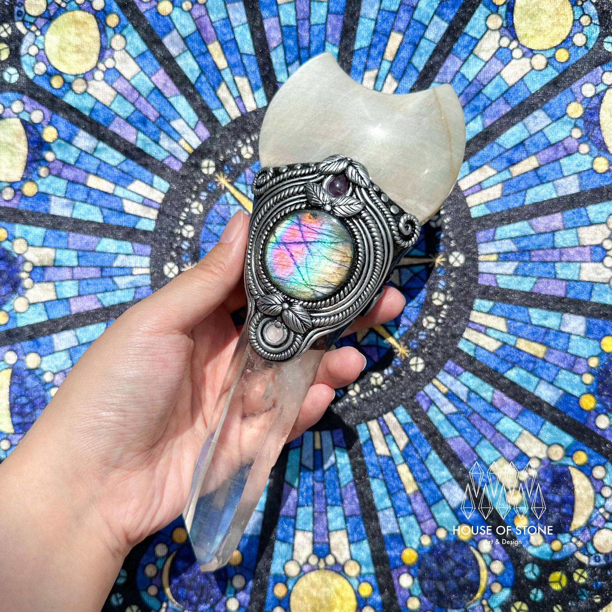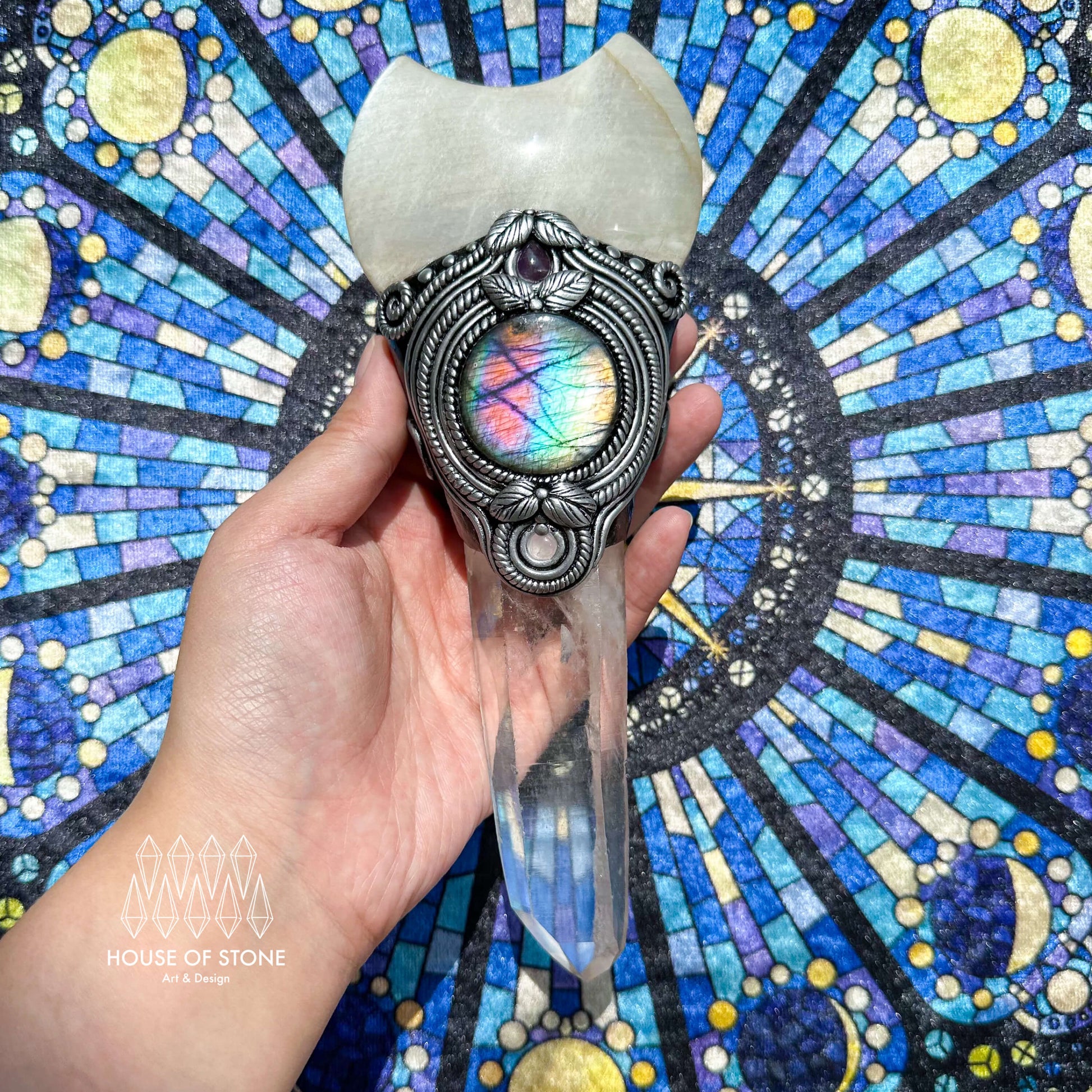 Natural Handmade Crystal Quartz Wand/Magic Witch Crystal Wand/Moonstone Brazil Clear Quartz Labradorite Wand/Chakra Healing/Manifest Altar Tool