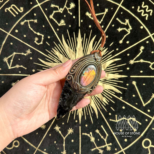 Natural Handmade Black Obsidian Arrowhead Pendant Necklace/Magic Crystal Double-sided Pendant/Labradorite Jewelry/Chakra/Altar Tool