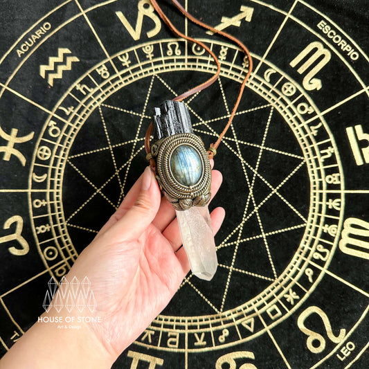 Natural Handmade Clear Quartz Pendant Necklace/Magic Black Tourmaline Crystal Double-sided Pendant/Labradorite Jewelry/Chakra/Altar Tool