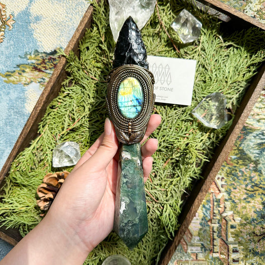 Natural Handmade Moss Agate Crystal Wand/Magic Witch Crystal Wand/Black Obsidian Moss Agate Labradorite Wand/Chakra/Manifest Altar Tool