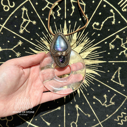 Natural Handmade Clear Quartz Life Circle Pendant Necklace/Magic Crystal Double-sided Pendant/Labradorite Jewelry/Crown Chakra/Altar Tool