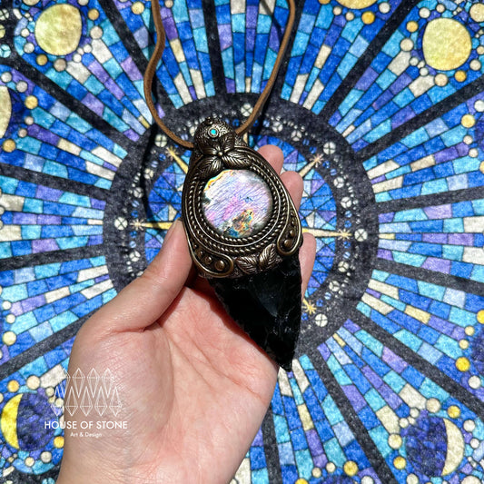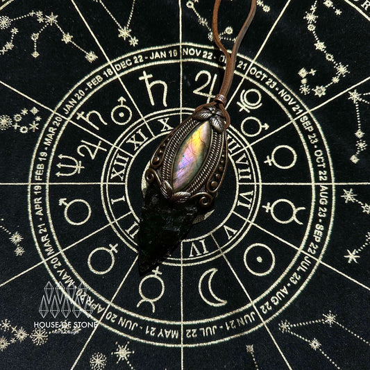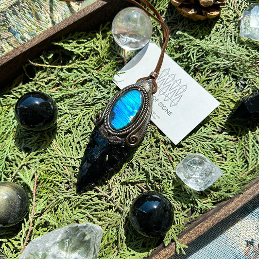 Natural Handmade Black Obsidian Arrowhead Pendant Necklace/Magic Crystal Double-sided Pendant/Labradorite Jewelry/Chakra/Altar Tool