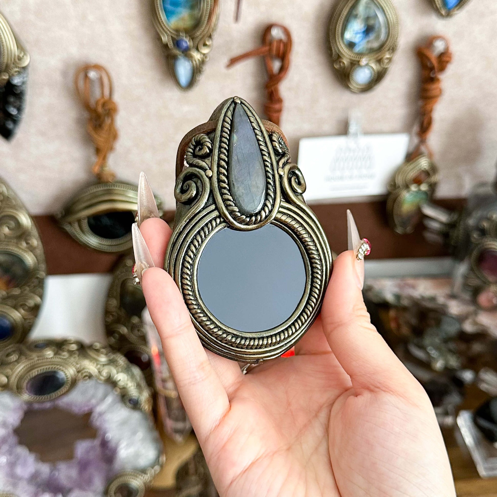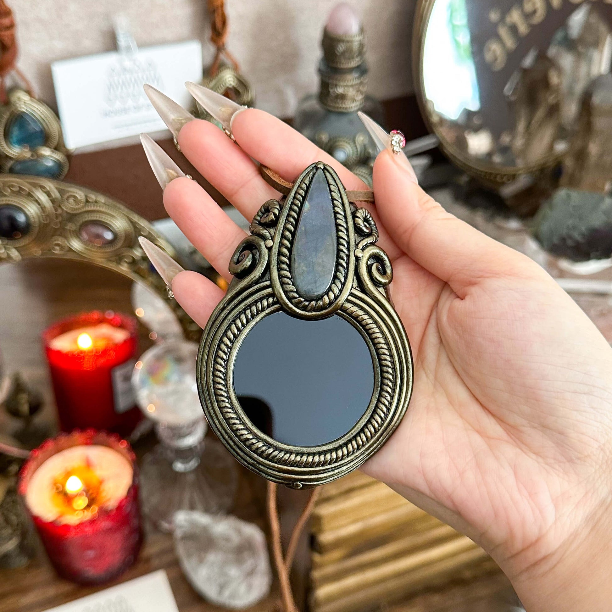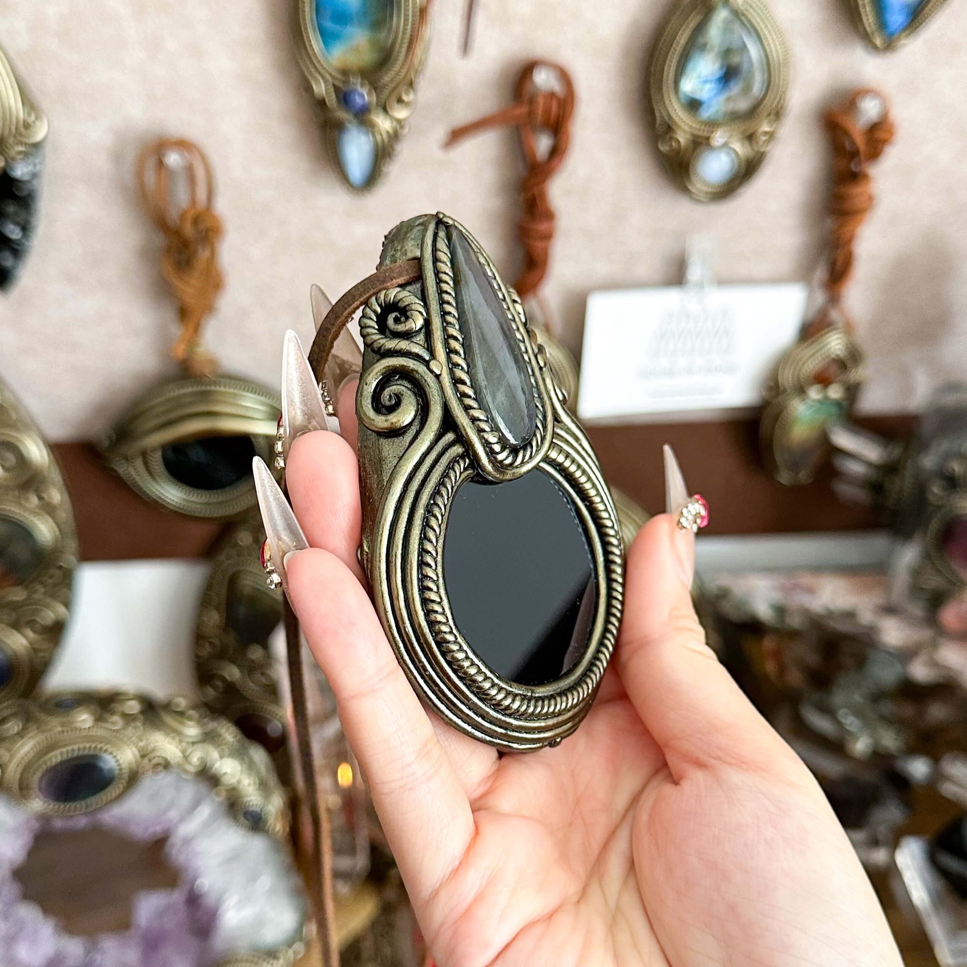 Handmade Natural Black Obsidian Pendant Necklace/Magic Obsidian Mirror Crystal Pendant/Scrying Mirror Labradorite Jewelry/Altar Tool