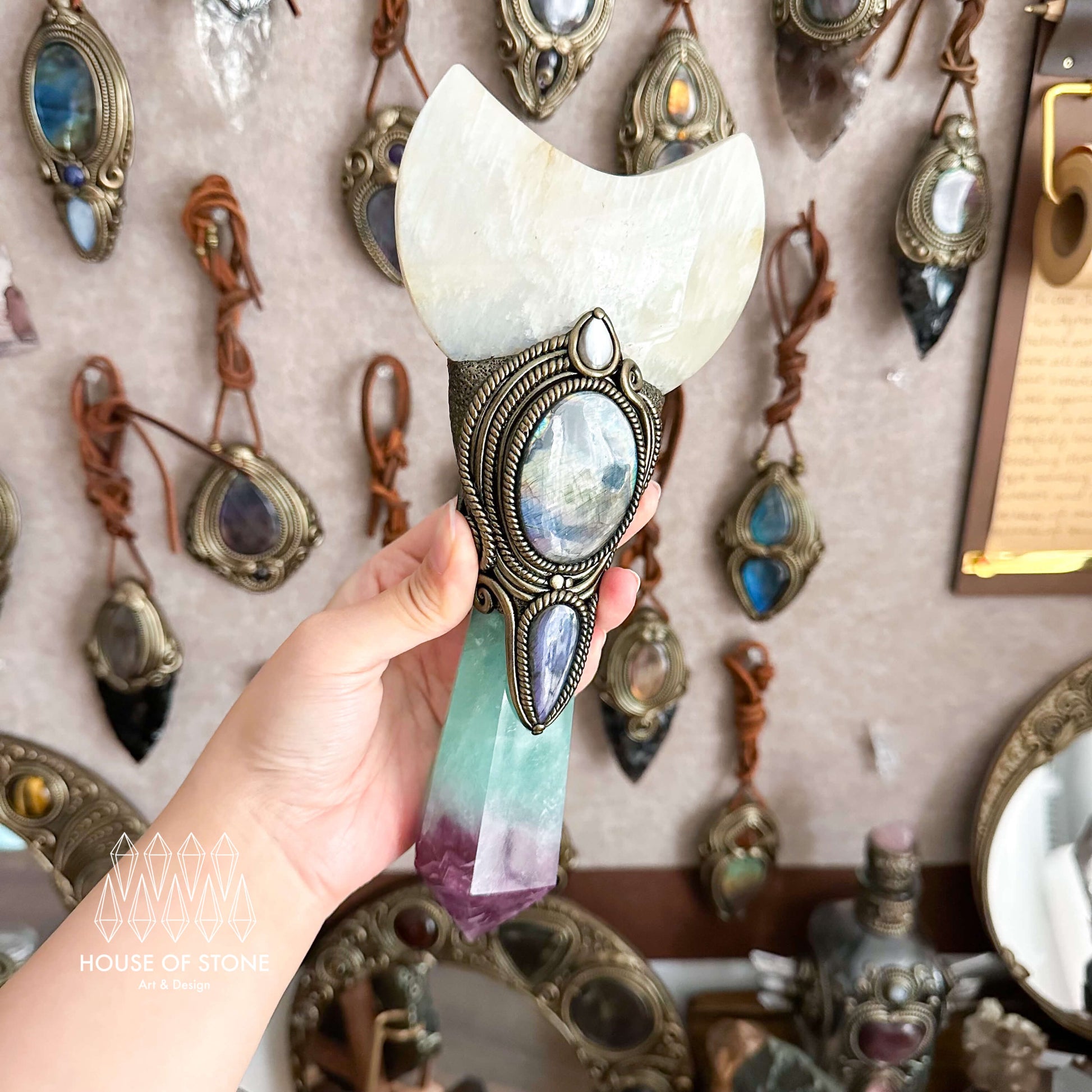 Handmade Natural Fluorite Crystal Wand/Magic Witch Crystal Wand/Moonstone Rainbow Fluorite Labradorite Handle/Chakra/Manifest Altar Tool