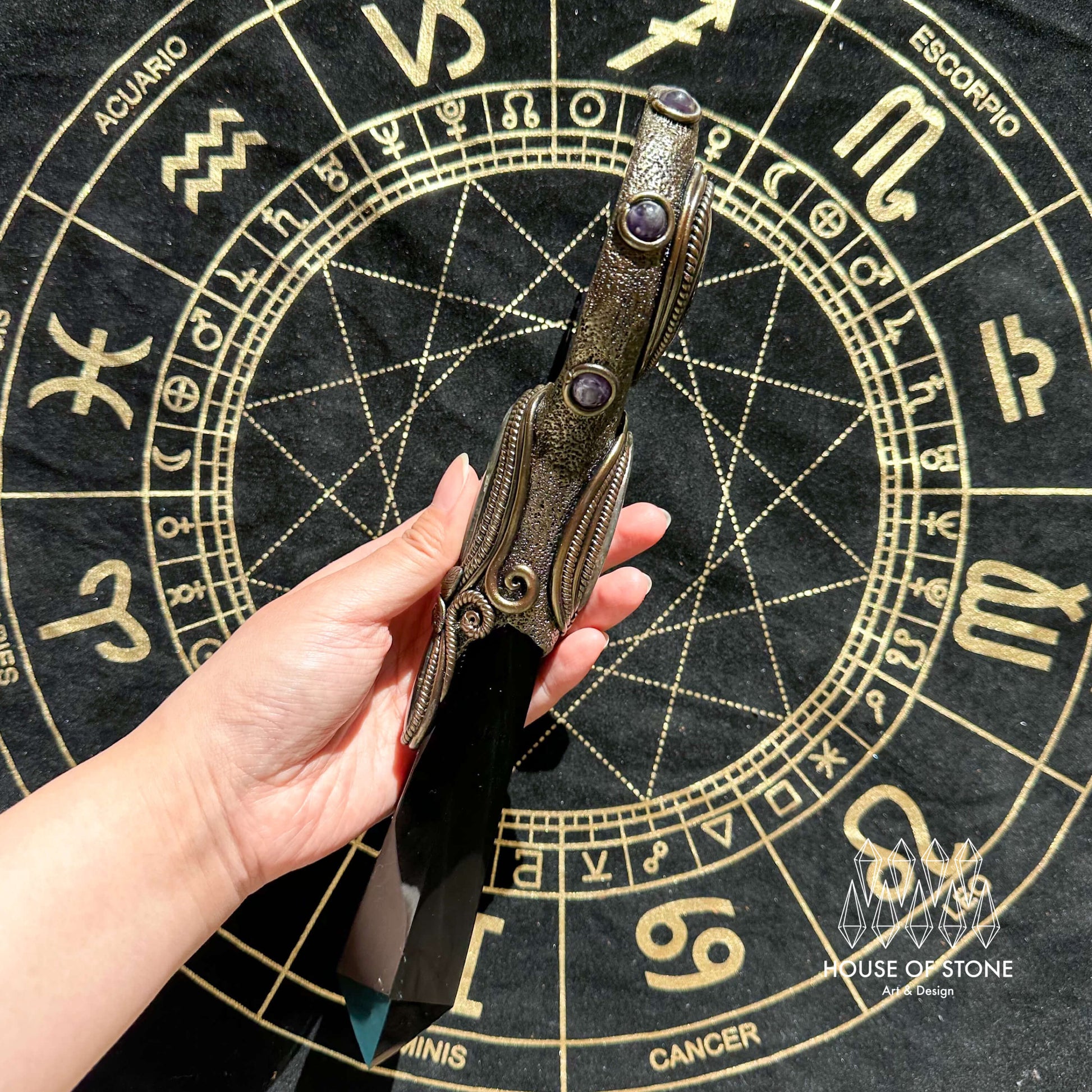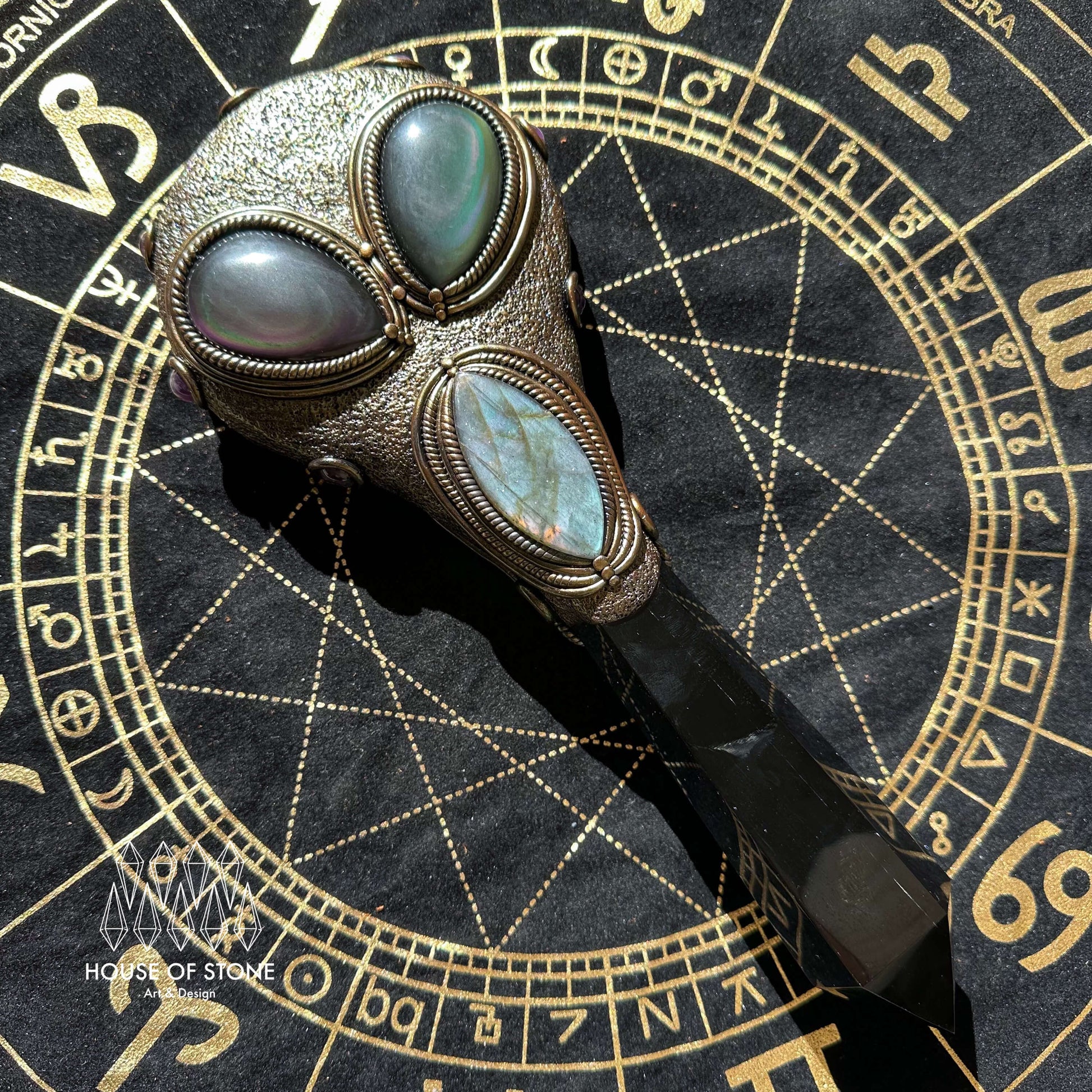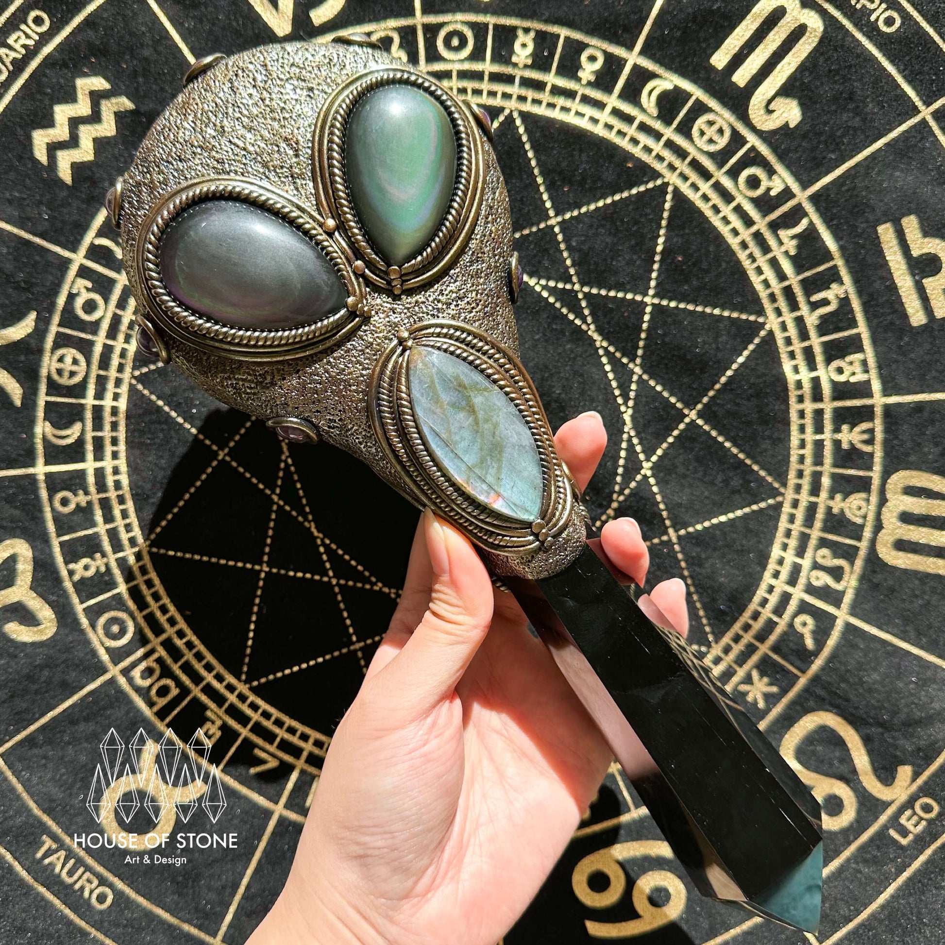 Handmade Natural Black Obsidian Mirror/Magic Obsidian Witch Wand/Crystal Quartz Wand/Scrying Mirror Wand/Chakra/Manifest Altar Tool