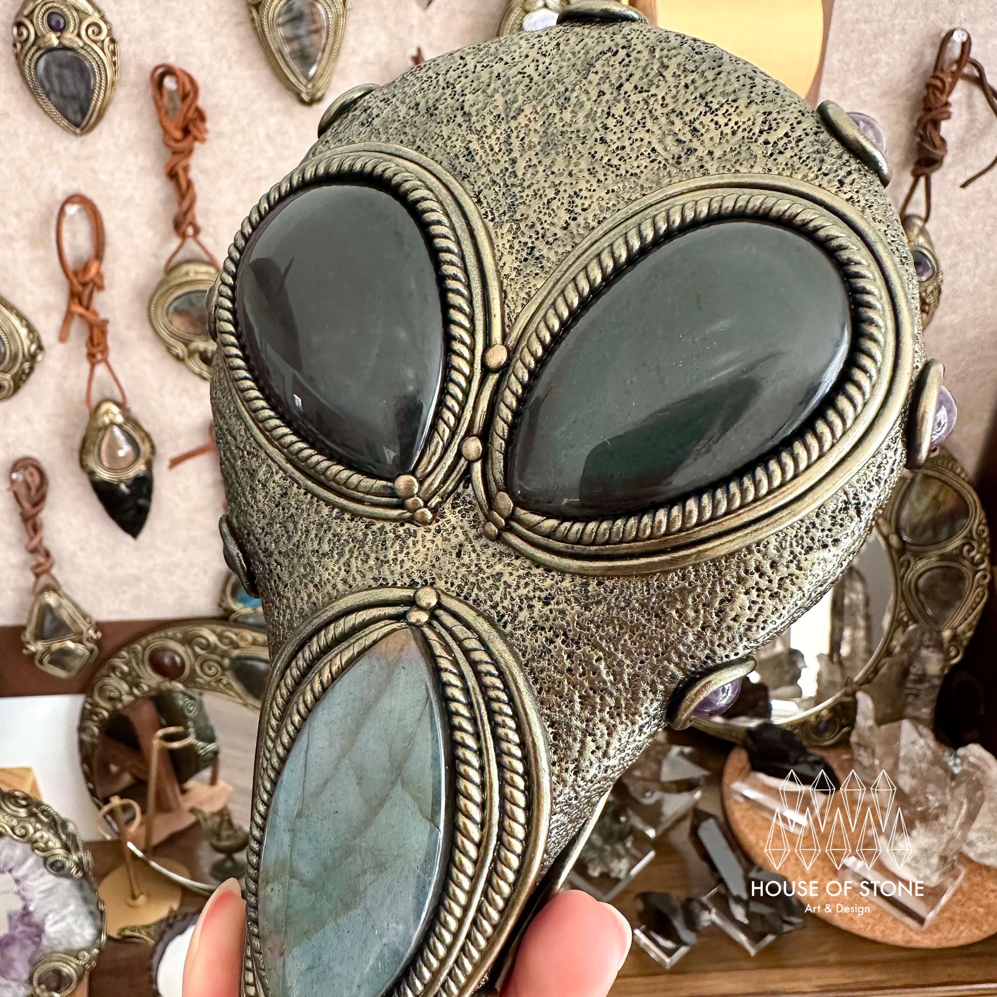 Black obsidian mirror, Labradorite, Rainbow obsidian, Amethyst, Clay