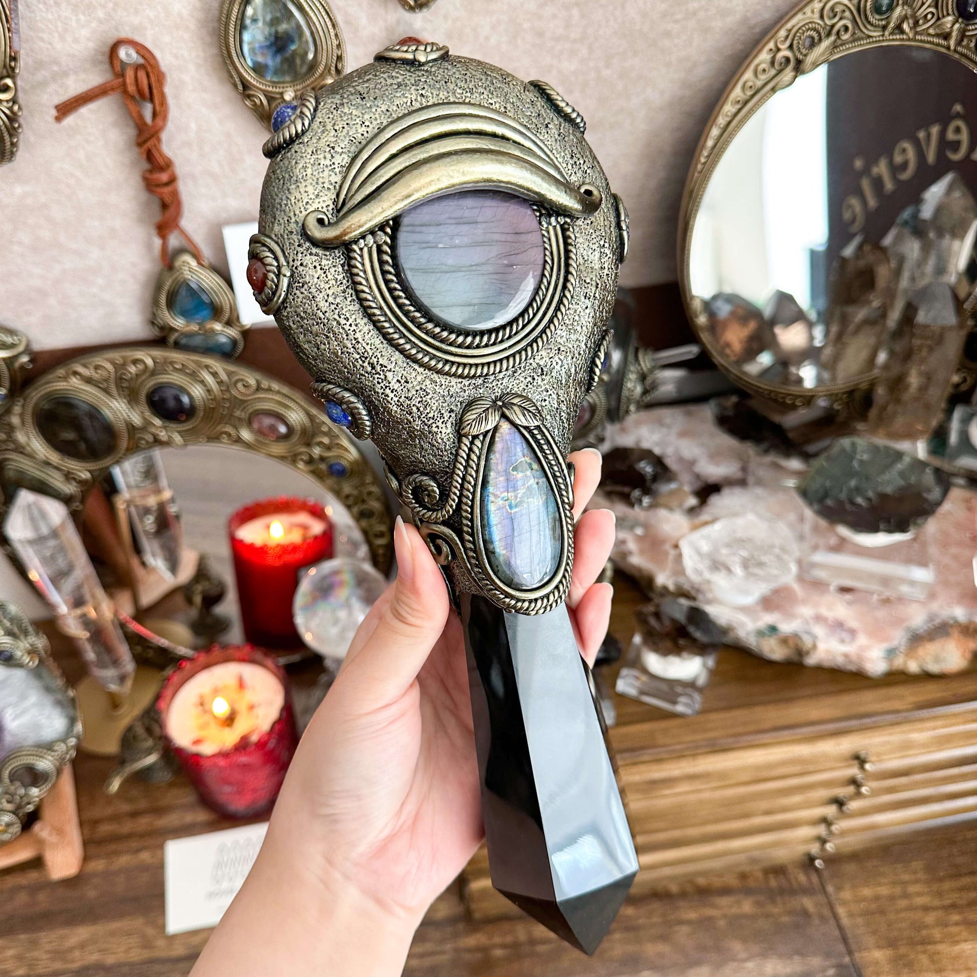 Black obsidian mirror, Amethyst, Carnelian, Labradorite, Lapis lazuli, Clay