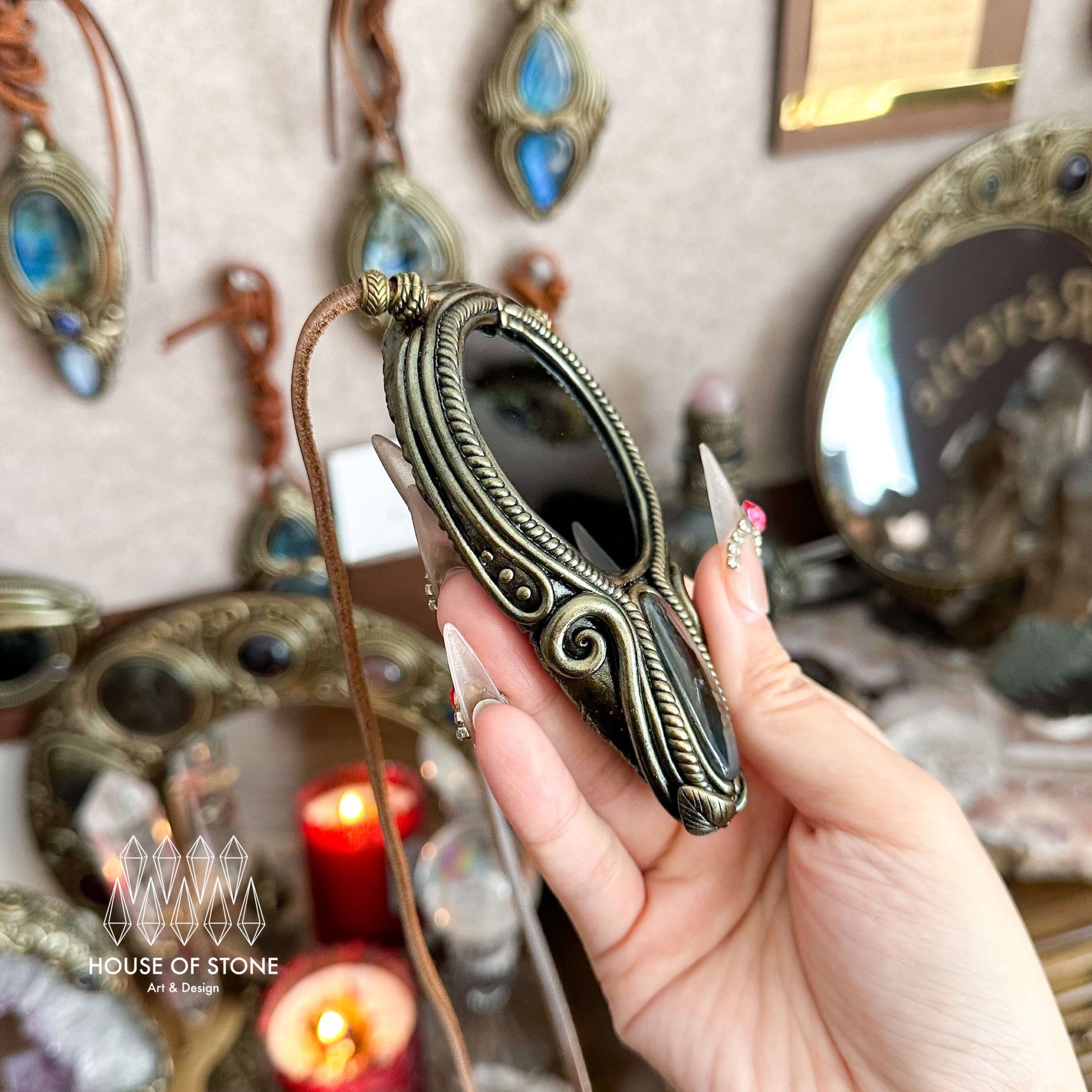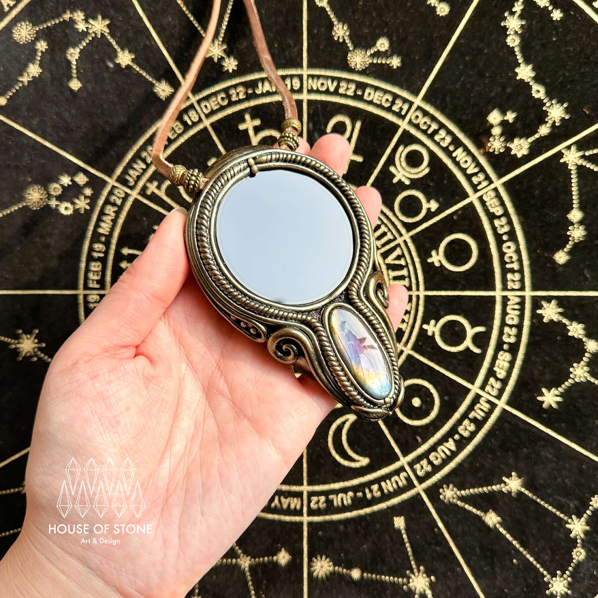 Black obsidian mirror, Labradorite, Clay