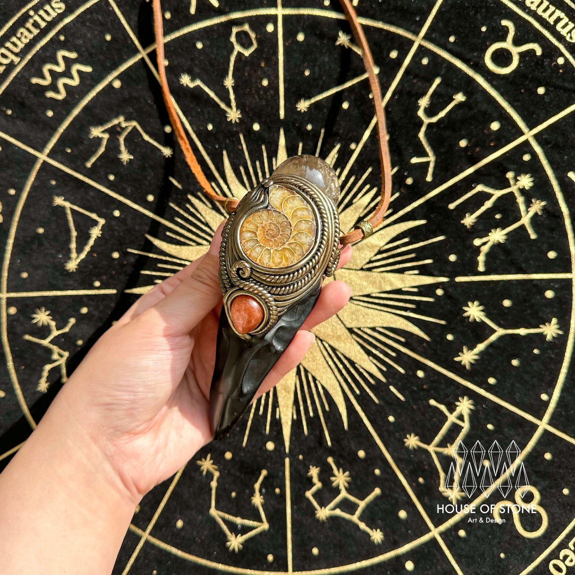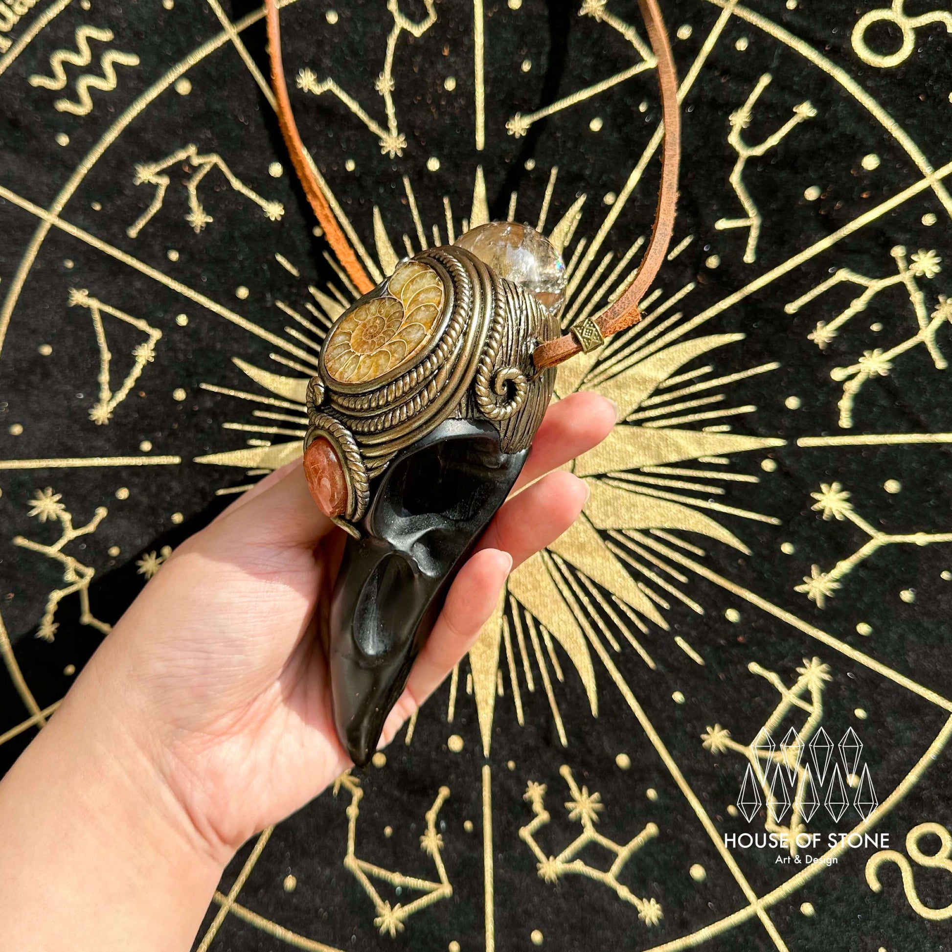 Handmade Natural Black Obsidian Raven Skull Pendant Necklace/Magic Smoky Quartz Crystal Protection Pendant/Ammonite Jewelry/Altar Tool