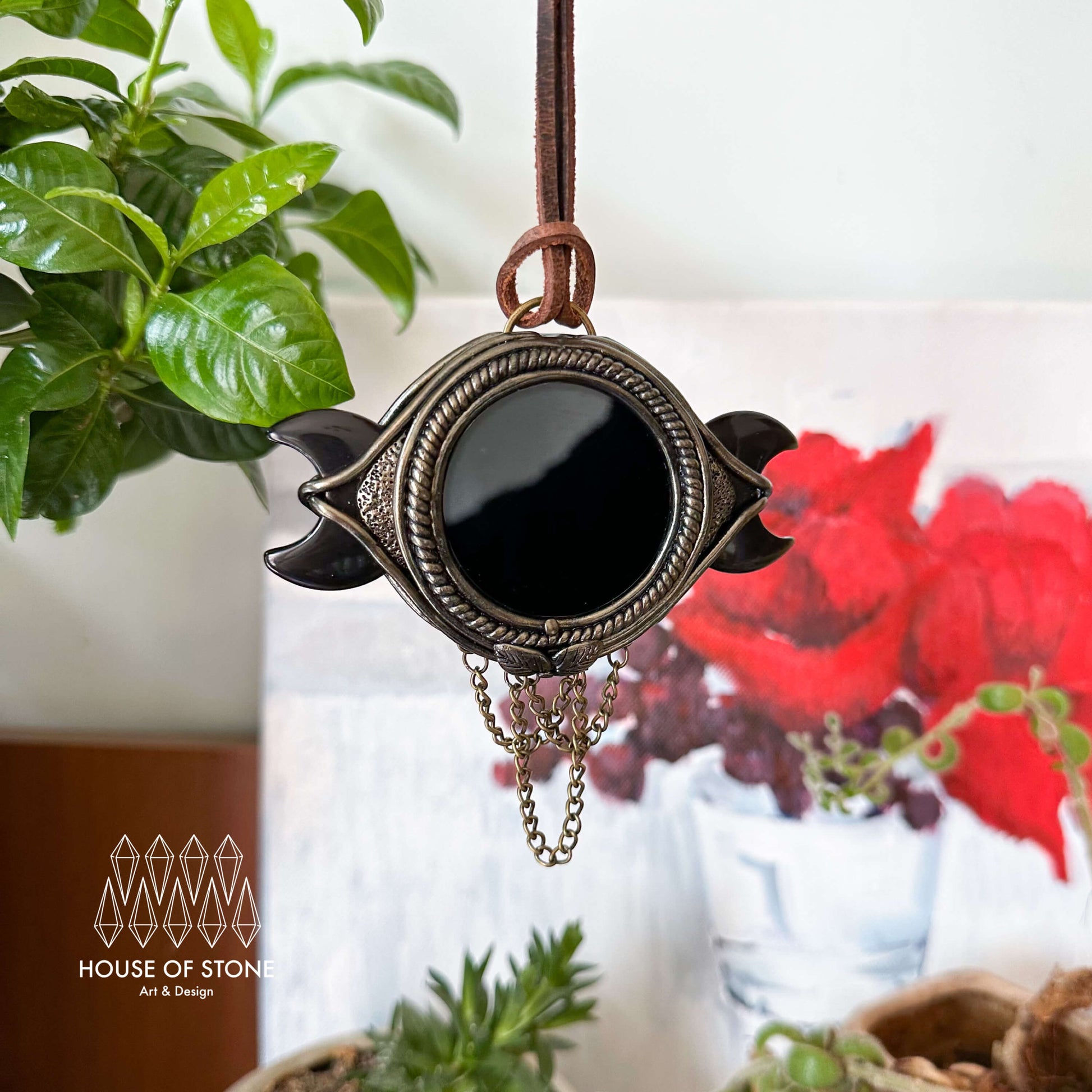 Handmade Natural Black Obsidian Triple Moon Pendant Necklace/Magic Obsidian Mirror Crystal Pendant/Scrying Mirror Protection Jewelry/Altar Tool