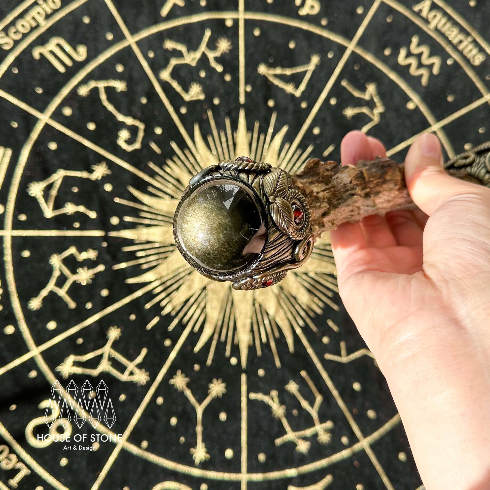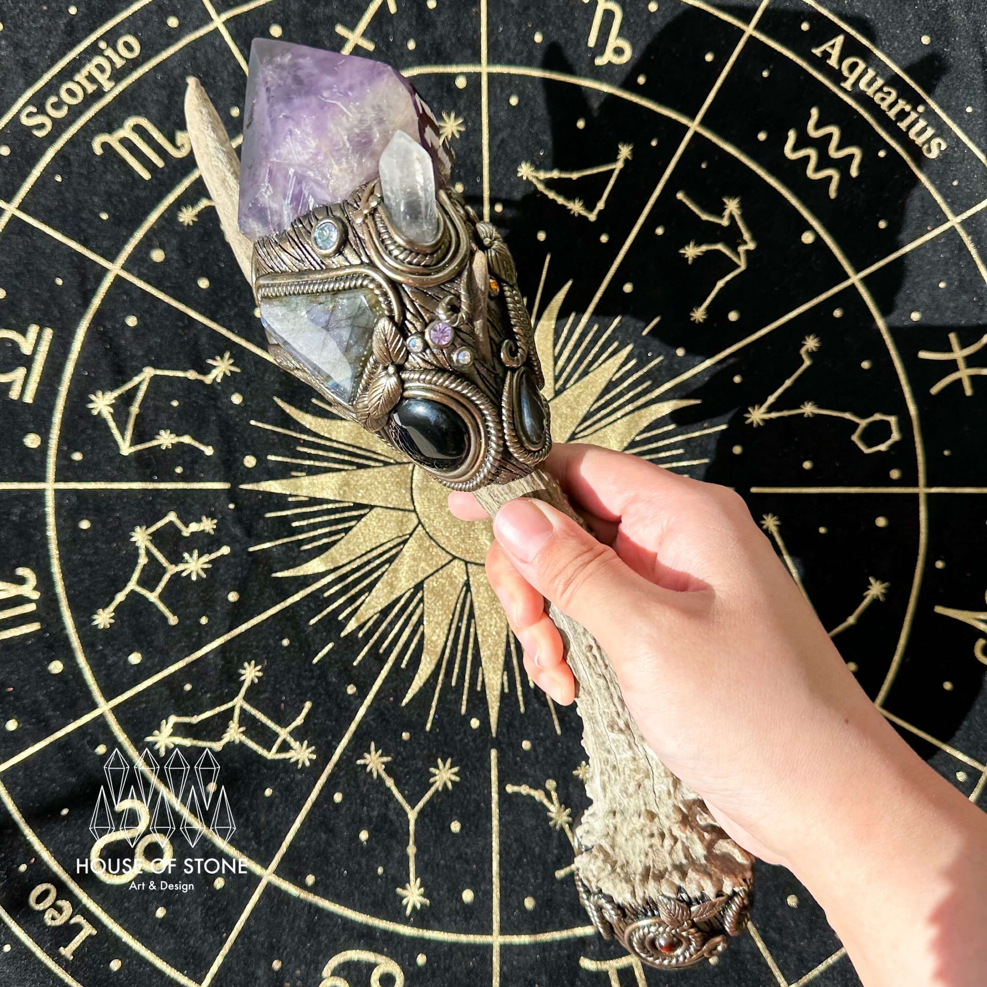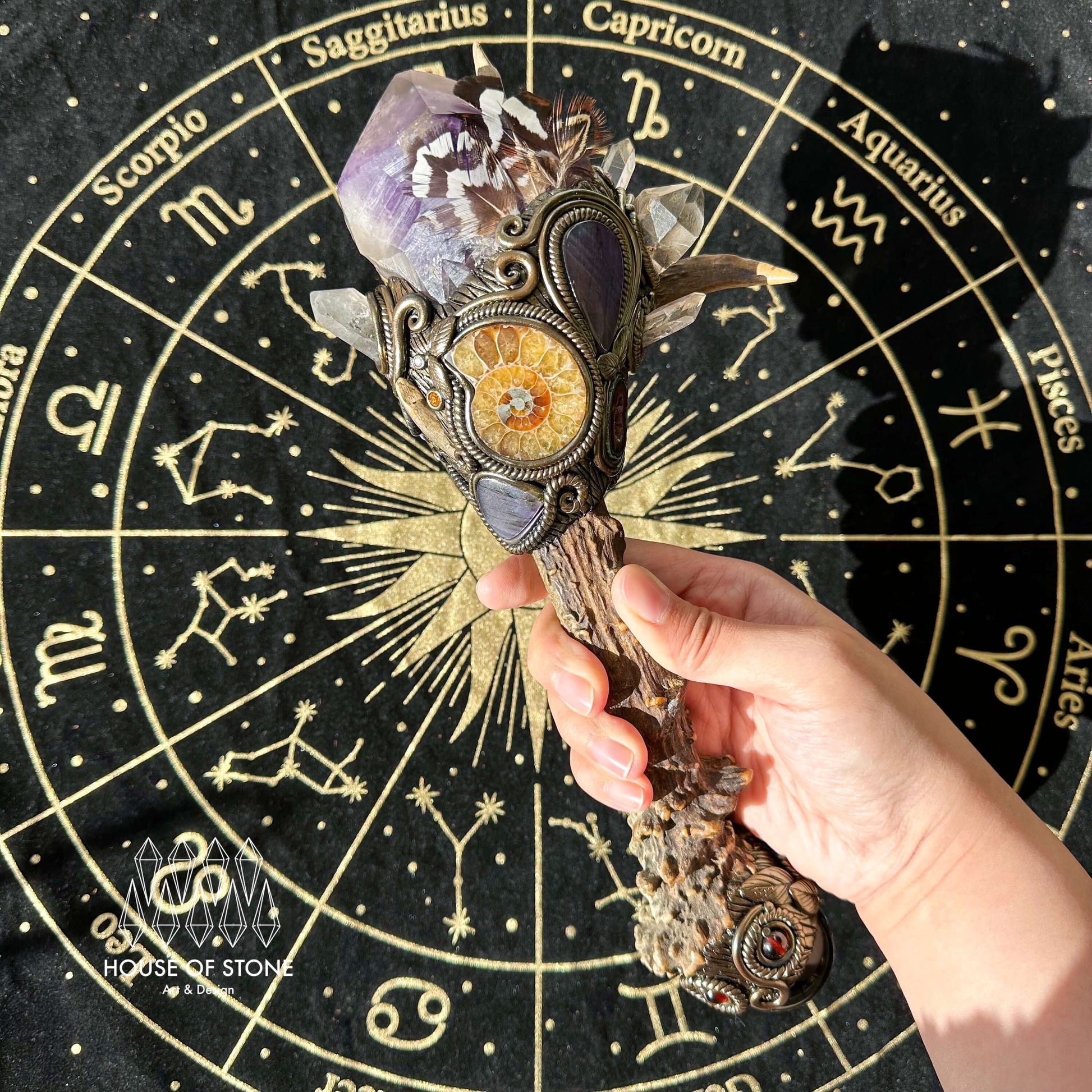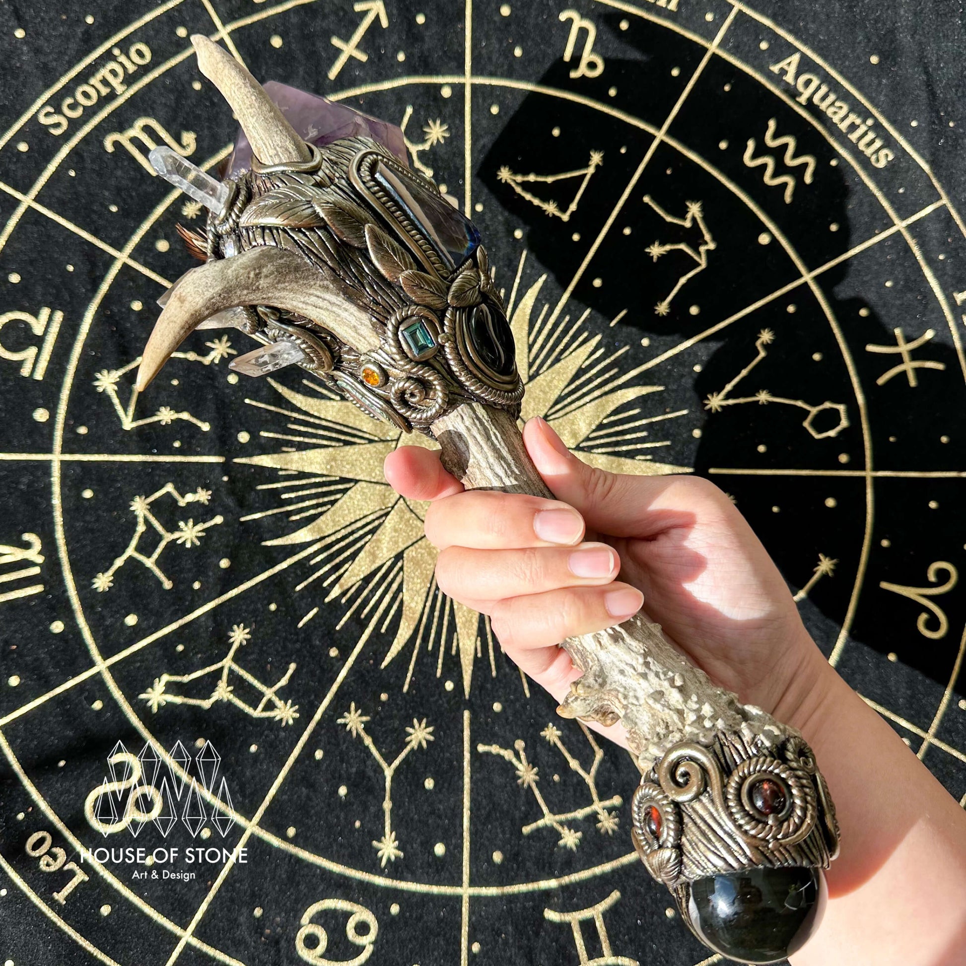 Handmade Natural Crystal Amethyst Antler Wand/Magic Smoky Quartz Witch Wand/Labradorite Amethyst Ammonite Antler Stem/Chakra/Altar Tool