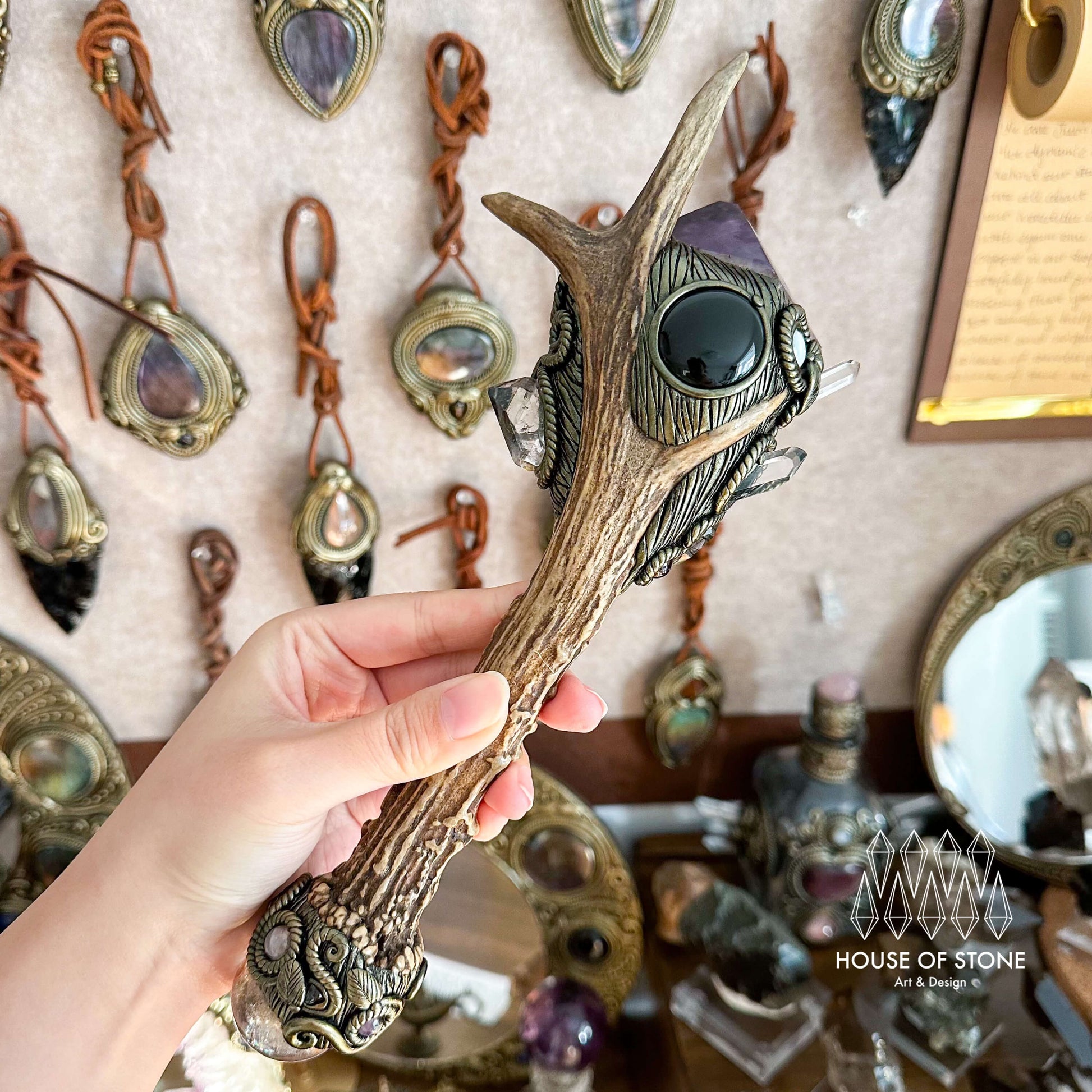 Handmade Natural Crystal Amethyst Antler Wand/Magic Smoky Quartz Witch Wand/Labradorite Amethyst Ammonite Antler Stem/Chakra/Altar Tool