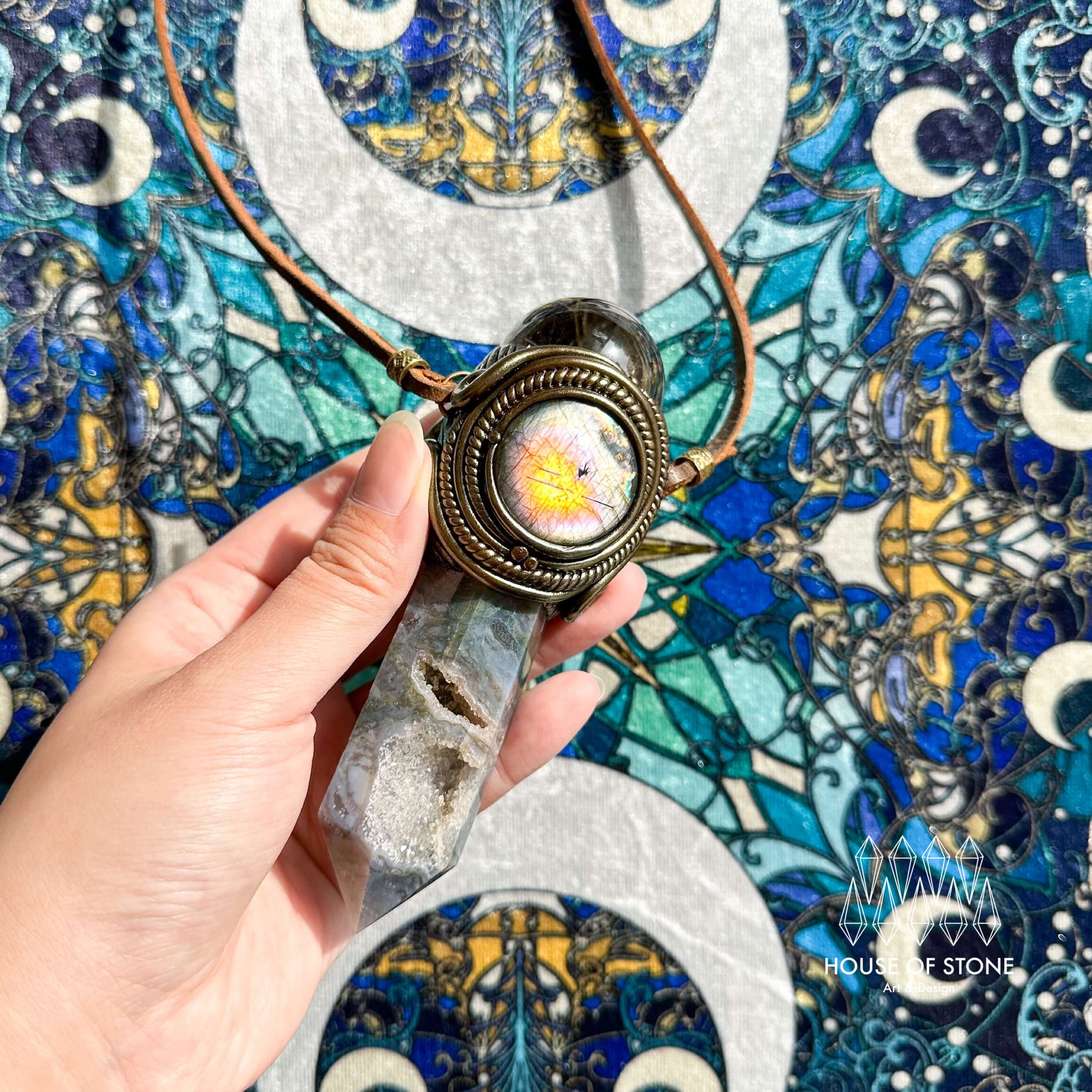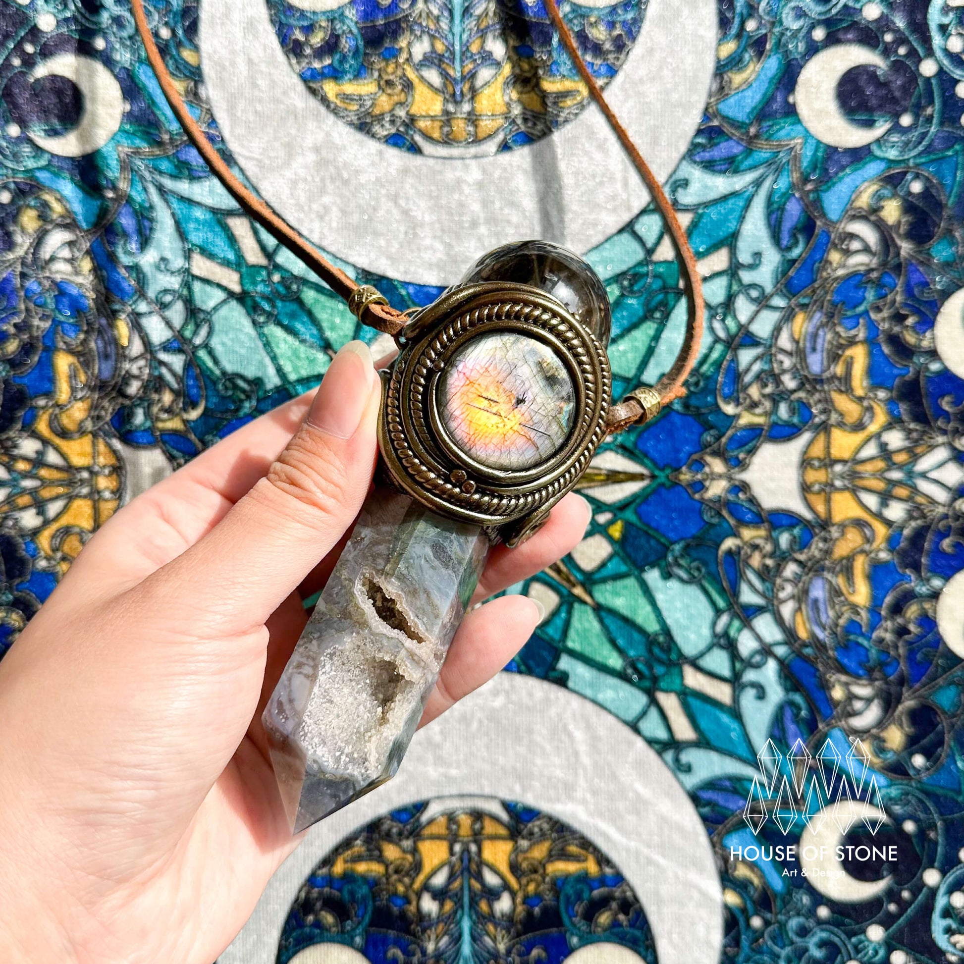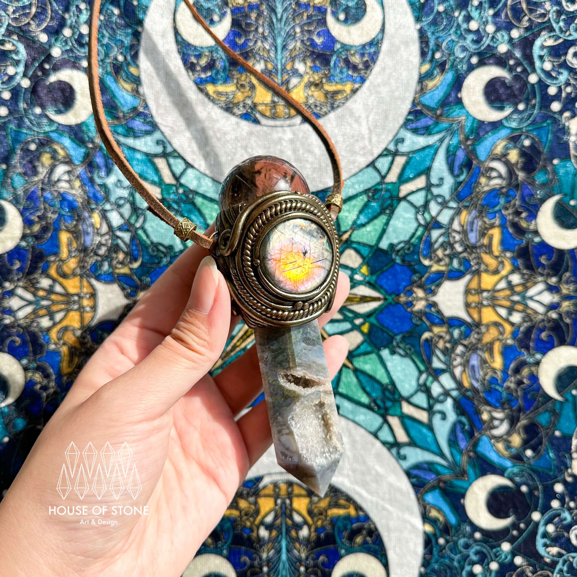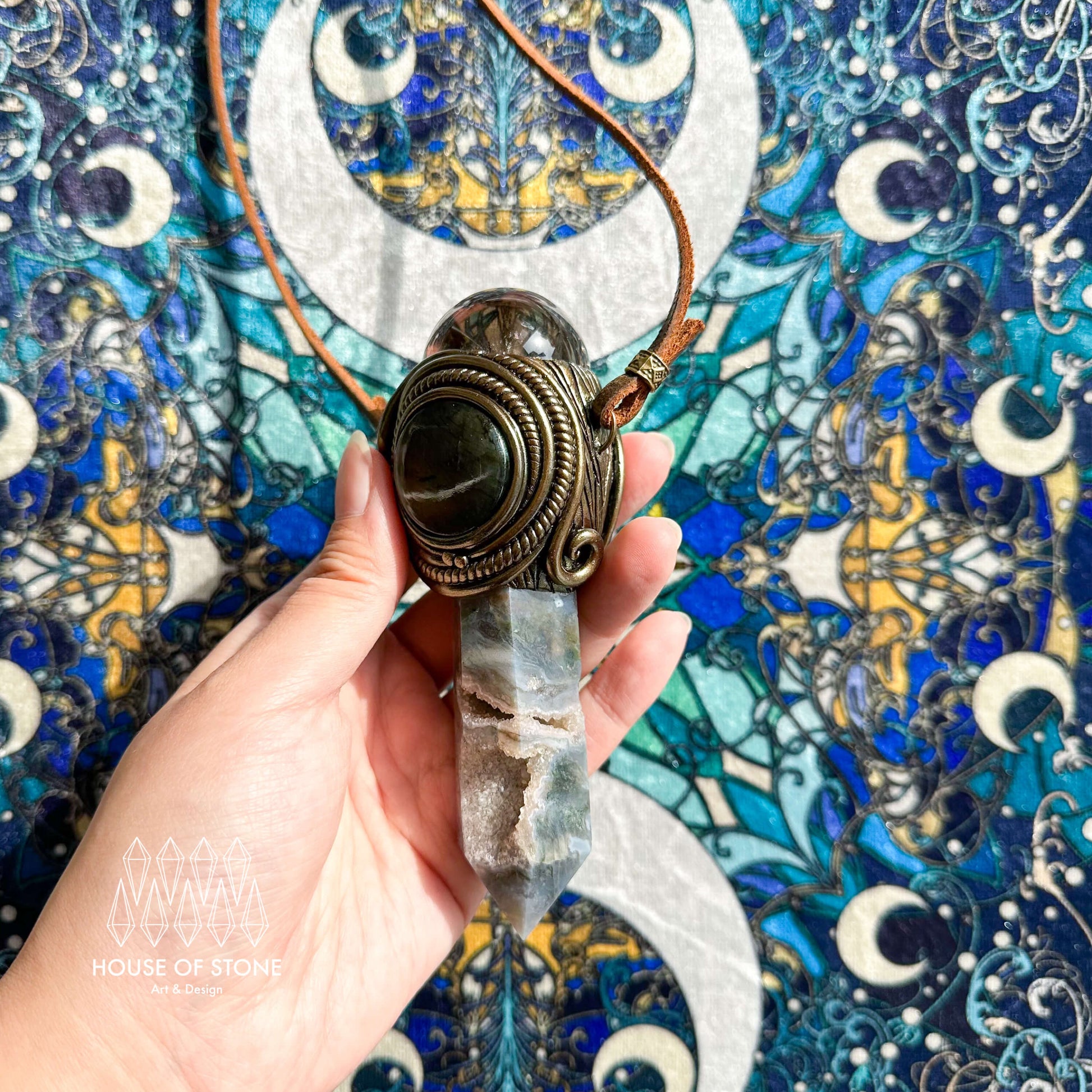 Handmade Natural Moss Agate Pendant Necklace/Magic Smoky Quartz Protection Pendant/Labradorite Jewelry/Heart Chakra/Altar Tool